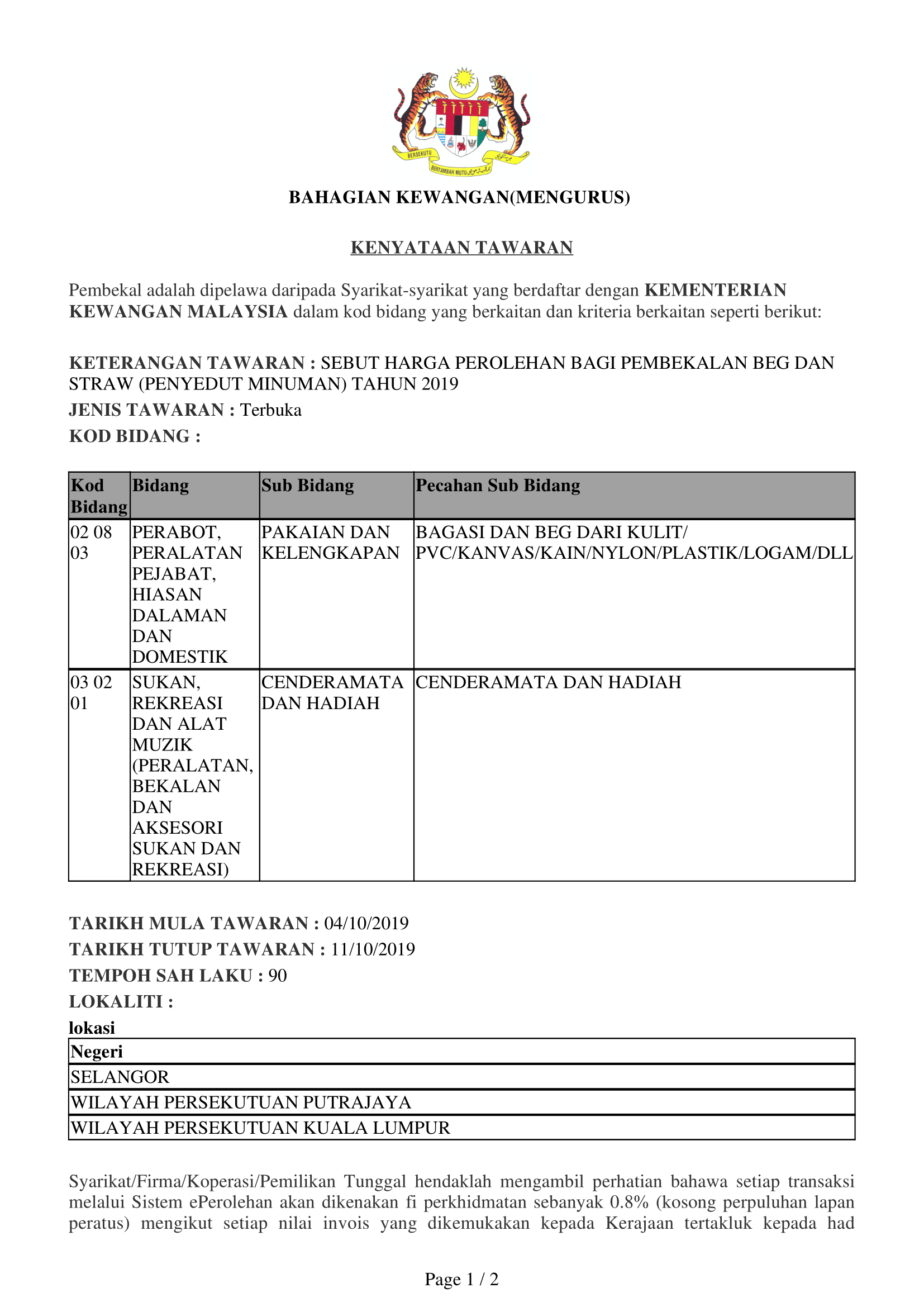 » » Pelawaan Sebut Harga : Perolehan Bagi Pembekalan Beg Dan Straw (Penyedut Minuman) Tahun 2019
