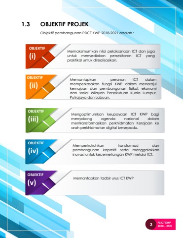 PSICT KWP2018 - 2021 31.3 OBJEKTIF PROJEKObjektif pembangunan PSICT KWP 2018-2021 adalah :OBJEKTIF (ii)Memantapkan peranan ICT dalam memperkasakan fungsi KWP dalam menerajui kemajuan dan pembangunan fizikal, ekonomi dan sosial Wilayah Persekutuan Kuala Lumpur, Putrajaya dan Labuan.Memaksimumkan nilai pelaksanaan ICT dan juga untuk menyediakan persekitaran ICT yang praktikal untuk direalisasikan.OBJEKTIF(i)OBJEKTIF(iii)Mengoptimumkan keupayaan ICT KWP bagimenyokong agenda nasional dalam mentransformasikan perkhidmatan Kerajaan ke arah perkhidmatan digital bersepadu.OBJEKTIF(iv)OBJEKTIF(v)Memperkukuhkan transformasi dan pembangunan kapasiti serta menggalakkan inovasi untuk kecemerlangan KWP melalui ICT.Memantapkan tadbir urus ICT KWP