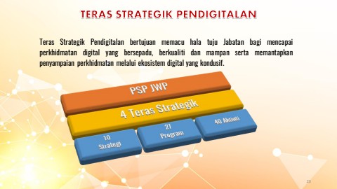 23Teras Strategik Pendigitalan bertujuan memacu hala tuju Jabatan bagi mencapaiperkhidmatan digital yang bersepadu, berkualiti dan mampan serta memantapkanpenyampaian perkhidmatan melalui ekosistem digital yang kondusif.