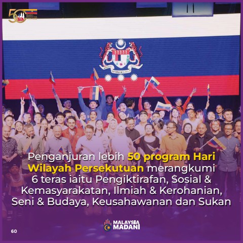 Penganjuran lebih 50 program Hari Wilayah Persekutuan merangkumi6 teras iaitu Pengiktirafan, Sosial & Kemasyarakatan, Ilmiah & Kerohanian, Seni & Budaya, Keusahawanan dan Sukan60