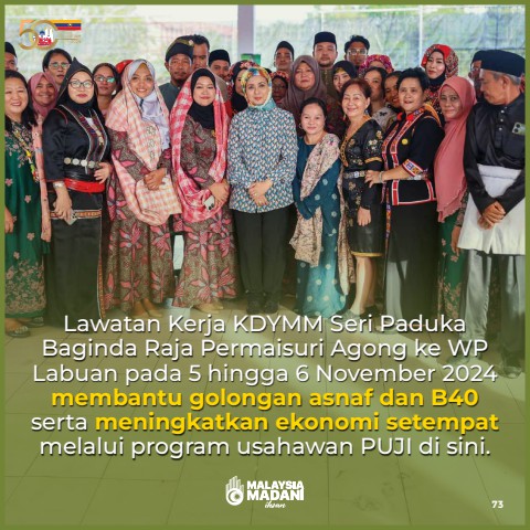 Lawatan Kerja KDYMM Seri Paduka Baginda Raja Permaisuri Agong ke WP Labuan pada 5 hingga 6 November 2024 membantu golongan asnaf dan B40 serta meningkatkan ekonomi setempat melalui program usahawan PUJI di sini.73