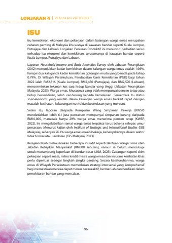 ISUIsu kemiskinan, ekonomi dan pekerjaan dalam kalangan warga emas merupakan cabaran penting di Malaysia khususnya di kawasan bandar seperti Kuala Lumpur, Putrajaya dan Labuan. Lonjakan Penuaan Produktif ini menuntut perhatian serius terhadap isu ekonomi dan kemiskinan, terutamanya di kawasan bandar seperti Kuala Lumpur, Putrajaya dan Labuan.Laporan Household Income and Basic Amenities Survey oleh Jabatan Perangkaan (2012) menunjukkan kadar kemiskinan dalam kalangan warga emas adalah 1.96%, hampir dua kali ganda kadar kemiskinan golongan muda yang berada pada tahap 0.79%. Di Wilayah Persekutuan, Pendapatan Garis Kemiskinan (PGK) bagi tahun 2022 ialah RM2,816 (Kuala Lumpur), RM2,450 (Putrajaya), dan RM2,576 (Labuan), mencerminkan tekanan kos sara hidup bandar yang tinggi (Jabatan Perangkaan Malaysia, 2023). Warga emas, khususnya yang tidak mempunyai pencen tetap atau hidup bersendirian, lebih cenderung kepada kemiskinan. Sementara itu status sosioekonomi yang rendah dalam kalangan warga emas berkait rapat dengan masalah kesihatan, kekurangan nutrisi dan kecerdasan yang merosot.Selain itu, laporan daripada Kumpulan Wang Simpanan Pekerja (KWSP) mendedahkan lebih 6.1 juta pencarum mempunyai simpanan kurang daripada RM10,000, manakala hanya 29% warga emas menerima pencen tetap (KWSP, 2022). Ini mengakibatkan ramai warga emas terpaksa terus bekerja selepas umur persaraan. Menurut kajian oleh Institute of Strategic and International Studies (ISIS Malaysia), sebanyak 26.1% warga emas masih bekerja, kebanyakannya dalam sektor tidak formal atau sambilan (ISIS Malaysia, 2023).Kerajaan telah melaksanakan beberapa inisiatif seperti Bantuan Warga Emas oleh Jabatan Kebajikan Masyarakat (RM500 sebulan), namun ia belum mencukupi untuk menampung keperluan di bandar besar (JKM, 2023). Cadangan seperti skim pekerjaan separa masa, mikro kredit mesra warga emas dan insurans kesihatan khas perlu diperluas sebagai langkah jangka panjang. Secara keseluruhannya, warga emas di Wilayah Persekutuan memerlukan strategi intervensi yang komprehensif bagi memastikan mereka dapat menua secara aktif, bermaruah dan berdikari dalam persekitaran bandar yang mencabar.LONJAKAN 4 PENUAAN PRODUKTIF96