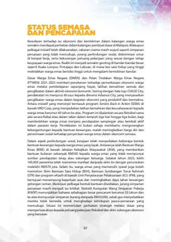 STATUS SEMASA DAN PENCAPAIANKesedaran terhadap isu ekonomi dan kemiskinan dalam kalangan warga emas semakin mendapat perhatian dalam kalangan pembuat dasar di Malaysia. Walaupun pelbagai inisiatif telah dilaksanakan, cabaran utama masih wujud seperti simpanan persaraan yang tidak mencukupi, jurang perlindungan sosial, diskriminasi umur di tempat kerja, serta kekurangan peluang pekerjaan yang sesuai dengan tahap keupayaan warga emas. Realiti ini menjadi semakin genting di bandar-bandar besar seperti Kuala Lumpur, Putrajaya dan Labuan, di mana kos sara hidup yang tinggi meletakkan warga emas berisiko tinggi untuk mengalami kemiskinan bandar.Dasar Warga Emas Negara (DWEN) dan Pelan Tindakan Warga Emas Negara (PTWEN) 2021%u20132025 memberi penekanan terhadap pemerkasaan ekonomi warga emas melalui pembelajaran sepanjang hayat, latihan kemahiran semula dan penglibatan dalam aktiviti ekonomi komuniti. Seiring dengan hala tuju CHASE City, pendekatan ini menjurus khusus kepada dimensi Advance City, yang menyasarkan penglibatan warga emas dalam kegiatan ekonomi yang produktif dan bermakna. Antara inisiatif yang menonjol termasuk program Seniors Back in Action (SEBA) di bawah HRD Corp, yang menyediakan latihan kemahiran dan keusahawanan kepada warga emas berumur 60 tahun ke atas. Program ini dijalankan secara fleksibel sama ada secara fizikal atau dalam talian dalam tempoh tiga hari hingga tiga bulan, bagi membolehkan warga emas menjana pendapatan sampingan atau kembali aktif dalam pasaran kerja. Pendekatan ini bukan sahaja membantu mengurangkan kebergantungan kepada bantuan kewangan, malah meningkatkan harga diri dan penerimaan sosial terhadap penyertaan warga emas dalam ekonomi semasa.Dalam aspek perlindungan sosial, kerajaan telah menyediakan beberapa bentuk bantuan kewangan kepada warga emas yang layak. Antaranya ialah Bantuan Warga Emas (BWE) di bawah Jabatan Kebajikan Masyarakat (JKM), yang memberikan bantuan bulanan sebanyak RM500 kepada warga emas yang tidak mempunyai sumber pendapatan tetap atau sokongan keluarga. Setakat tahun 2023, lebih 140,000 penerima telah menerima manfaat daripada skim ini dengan peruntukan melebihi RM570 juta. Selain itu, warga emas yang memenuhi syarat juga boleh memohon Skim Bantuan Sara Hidup (BSH), Bantuan Sumbangan Tunai Rahmah (STR) dan program eKasih di bawah Unit Penyelarasan Pelaksanaan (ICU JPM), yang bertujuan menampung keperluan asas dan meningkatkan daya tahan kewangan golongan rentan. Meskipun pelbagai bentuk bantuan disediakan, jurang simpanan persaraan masih menjadi isu kritikal. Statistik Kumpulan Wang Simpanan Pekerja (KWSP) menunjukkan bahawa sebahagian besar pencarum berumur 55 tahun dan ke atas mempunyai simpanan kurang daripada RM10,000, sekali gus menyebabkan mereka tidak bersedia untuk menghadapi kehidupan pasca-persaraan yang mencukupi. Situasi ini memerlukan perhatian strategik melalui dasar yang memperluas akses kepada peluang pekerjaan fleksibel dan skim sokongan ekonomi yang bersasar.97