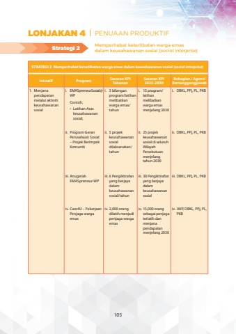 STRATEGI 2 Memperhebat keterlibatan warga emas dalam keusahawanan sosial (social interprise)InisiatifProgramSasaran KPI TahunanSasaran KPI 2025-2030Bahagian / Agensi Bertanggungjawab1.Menjana pendapatan melalui aktiviti keusahawanan sosiali.EMASpreneurSosial@WPContoh:%u2022Latihan Asas keusahawanan sosial;i.3 bilangan program/latihan melibatkan warga emas/tahuni.15 program/latihan melibatkan warga emas menjelang 2030i.DBKL, PPj, PL, PKBii.Program Geran Perusahaan Sosial %u2013 Projek Berimpak Komunitiii.5 projek keusahawanan sosial dilaksanakan/tahunii.25 projek keusahawanan sosial di seluruh Wilayah Persekutuan menjelang tahun 2030ii.DBKL, PPj, PL, PKBiii.Anugerah EMASpreneur-WPiii.6 Pengiktirafan yang berjaya dalam keusahawanan sosial/tahuniii.30 Pengiktirafan yang berjaya dalam keusahawanan sosialiii.DBKL, PPj, PL, PKBiv.Care4U %u2013 Pekerjaan Penjaga warga emasiv.2,000 orang dilatih menjadi penjaga warga emasiv.15,000 orang sebagai penjaga terlatih dan menjana pendapatan menjelang 2030iv.JWP, DBKL, PPj, PL, PKBMemperhebat keterlibatan warga emas dalam keusahawanan sosial ()Strategi 2LONJAKAN 4 PENUAAN PRODUKTIF105
