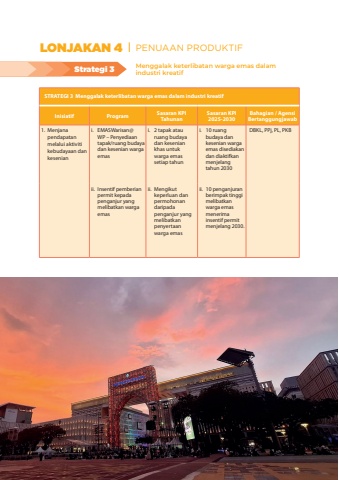 STRATEGI 3 Menggalak keterlibatan warga emas dalam industri kreatifInisiatifProgramSasaran KPI TahunanSasaran KPI 2025-2030Bahagian / Agensi Bertanggungjawab1.Menjana pendapatan melalui aktiviti kebudayaan dan keseniani.EMASWarisan@WP %u2013 Penyediaan tapak/ruang budaya dan kesenian warga emasi.2 tapak atau ruang budaya dan kesenian%u00a0khas untuk warga emas setiap tahuni.10 ruang budaya dan kesenian warga emas disediakan dan diaktifkan menjelang tahun 2030DBKL, PPj, PL, PKBii.Insentif pemberian permit kepada penganjur yang melibatkan warga emasii.Mengikut keperluan dan permohonan daripada penganjur yang melibatkan penyertaan warga emasii.10 penganjuran berimpak tinggi%u00a0 melibatkan warga emas menerima insentif permit menjelang 2030.Menggalak keterlibatan warga emas dalam industri kreatifStrategi 3LONJAKAN 4 PENUAAN PRODUKTIF106