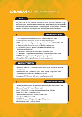 HASILMenjelang tahun 2030, Wilayah Persekutuan akan mencapai komuniti warga emas yang kekal produktif, berdikari dan terus menyumbang kepada ekonomi dan masyarakat melalui penyertaan dalam pekerjaan, keusahawanan, ekonomi komuniti serta aktiviti kebudayaan dan kesenian yang bernilai ekonomi.KAEDAH PEMANTAUAN1.1,000 warga emas ditempatkan dalam pekerjaan separuh masa.2.300 warga emas menerima insentif lesen tapak perniagaan.3.500 warga emas mendapat bantuan perusahaan mikro USAHAEMAS-WP.4.15 pertambahan kebun komuniti melibatkan warga emas.5.15 bilangan program / latihan melibatkan warga emas bagi EMASpreneurSosial@WP.6.10 koperasi EMASKOOP-WP yang aktif dan berdaya saing.7.30 penerima Anugerah EMASpreneur-WP dalam keusahawanan sosial8.15,000 peluang pekerjaan sebagai penjaga warga emas.9.Pengaktifan 10 ruang budaya dan kesenian warga emas.SIGNATURE PROGRAM1.MyKerjaFlex Emas@WP %u2013 platform padanan pekerjaan separuh masa khas2.EkonomiPerak@WP %u2013 Insentif lesen tapak3.USAHAEMAS-WP %u2013 Program Mikro Usahawan Emas Wilayah4.EMASKOOP-WP %u2013 Koperasi Komuniti5.EMASpreneurSosial@WP - Keusahawanan Sosial6.Anugerah EMASpreneur-WP7.CARE4U%u2013Program Pekerjaan Penjagaan Warga Emas8.EMASWarisan@WP %u2013 Industri KreatifQUICKWIN PROGRAM1.EkonomiPerak@WP %u2013 Pemberian insentif lesen tapak perniagaan kepada warga emas2.USAHAEMAS-WP %u2013 pemberian geran mikro kepada warga emas untuk memulakan atau mengembangkan perniagaan3.Anugerah EMASpreneur-WP dalam keusahawanan sosialLONJAKAN 4 PENUAAN PRODUKTIF107