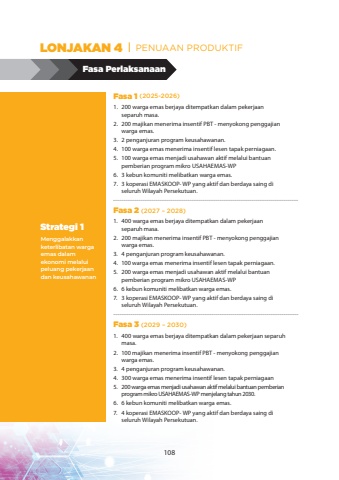 Fasa PerlaksanaanMenggalakkan keterlibatan warga emas dalam ekonomi melalui peluang pekerjaan dan keusahawananStrategi 1Fasa 1 (2025-2026)Fasa 2 (2027 %u2013 2028)Fasa 3 (2029 %u2013 2030)1.200 warga emas berjaya ditempatkan dalam pekerjaan separuh masa.2.200 majikan menerima insentif PBT - menyokong penggajian warga emas.3.2 penganjuran program keusahawanan.4.100 warga emas menerima insentif lesen tapak perniagaan.5.100 warga emas menjadi usahawan aktif%u00a0melalui bantuan pemberian program mikro USAHAEMAS-WP 6.3 kebun komuniti melibatkan warga emas.7.3 koperasi EMASKOOP- WP yang aktif dan berdaya saing di seluruh Wilayah Persekutuan.1.400 warga emas berjaya ditempatkan dalam pekerjaan separuh masa.2.200 majikan menerima insentif PBT - menyokong penggajian warga emas.3.4 penganjuran program keusahawanan.4.100 warga emas menerima insentif lesen tapak perniagaan.5.200 warga emas menjadi usahawan aktif%u00a0melalui bantuan pemberian program mikro USAHAEMAS-WP 6.6 kebun komuniti melibatkan warga emas.7.3 koperasi EMASKOOP- WP yang aktif dan berdaya saing di seluruh Wilayah Persekutuan.1.400 warga emas berjaya ditempatkan dalam pekerjaan separuh masa.2.100 majikan menerima insentif PBT - menyokong penggajian warga emas.3.4 penganjuran program keusahawanan.4.300 warga emas menerima insentif lesen tapak perniagaan5.200 warga emas menjadi usahawan aktif%u00a0melalui bantuan pemberian program mikro USAHAEMAS-WP menjelang tahun 2030.6.6 kebun komuniti melibatkan warga emas.7.4 koperasi EMASKOOP- WP yang aktif dan berdaya saing di seluruh Wilayah Persekutuan.LONJAKAN 4 PENUAAN PRODUKTIF108