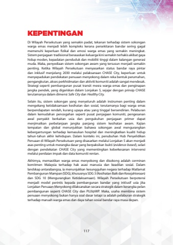 KEPENTINGANDi Wilayah Persekutuan yang semakin padat, tekanan terhadap sistem sokongan warga emas menjadi lebih kompleks kerana persekitaran bandar sering gagal memenuhi keperluan fizikal dan emosi warga emas yang semakin meningkat. Sistem penjagaan tradisional berasaskan keluarga kini semakin terhakis akibat gaya hidup moden, kepadatan penduduk dan mobiliti tinggi dalam kalangan generasi muda. Maka, penyediaan sistem sokongan awam yang tersusun menjadi semakin penting. Ketika Wilayah Persekutuan menyasarkan status bandar raya pintar dan inklusif menjelang 2030 melalui pelaksanaan CHASE City, keperluan untuk menyepadukan pendekatan penuaan menyokong dalam reka bentuk perumahan, pengangkutan, akses perkhidmatan dan aktiviti komuniti adalah sangat mendesak. Strategi seperti pembangunan pusat transit mesra warga emas dan penginapan jangka pendek, yang digariskan dalam Lonjakan 5, sejajar dengan prinsip CHASE terutamanya dalam dimensi SafeCity dan Healthy City.Selain itu, sistem sokongan yang menyeluruh adalah instrumen penting dalam mengekang ketidaksamaan kesihatan dan sosial, terutamanya bagi warga emas berpendapatan rendah, kurang upaya atau yang tinggal bersendirian. Pelaburan dalam kemudahan pencegahan seperti pusat penjagaan komuniti, pengesanan awal penyakit berkaitan usia dan pengukuhan penjagaan primer dapat menjimatkan perbelanjaan jangka panjang sistem kesihatan awam. Kajian tempatan dan global menunjukkan bahawa sokongan awal mengurangkan kebergantungan terhadap kemasukan hospital dan meningkatkan kualiti hidup tahun-tahun akhir kehidupan. Dalam konteks ini, penubuhan Hub Penyelidikan Penuaan di Wilayah Persekutuan yang disasarkan melalui Lonjakan 5 akan menjadi asas penting untuk merangka dasar yang berpaksikan bukti (evidence-based), selari dengan pendekatan CHASE City yang mementingkan keberkesanan intervensi melalui penilaian impak dan data komuniti rentan.Akhirnya, memastikan warga emas menyokong dan disokong adalah cerminan komitmen Malaysia terhadap hak asasi manusia dan keadilan sosial. Dalam landskap antarabangsa, ia menunjukkan kesungguhan negara terhadap Matlamat Pembangunan Mampan (SDG), khususnya SDG 3 (Kesihatan Baik dan Kesejahteraan) dan SDG 10 (Mengurangkan Ketidaksamaan). Wilayah Persekutuan berpotensi menjadi model perintis kepada pembangunan bandar yang inklusif usia jika Lonjakan Penuaan Menyokong dilaksanakan secara strategik dalam kerangka pelan pembangunan seperti CHASE City dan PUJI@WP. Maka, usaha membina sistem penuaan menyokong bukan hanya soal dasar tetapi ia adalah pelaburan strategik terhadap maruah warga emas dan daya tahan sosial bandar raya masa depan.117