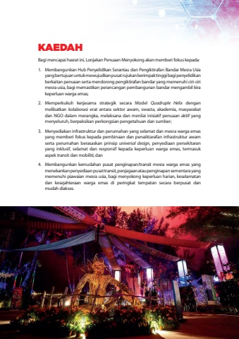 KAEDAHBagi mencapai hasrat ini, Lonjakan Penuaan Menyokong akan memberi fokus kepada:1.Membangunkan Hub Penyelidikan Serantau dan Pengiktirafan Bandar Mesra Usia yang bertujuan untuk mewujudkan pusat rujukan berimpak tinggi bagi penyelidikan berkaitan penuaan serta mendorong pengiktirafan bandar yang memenuhi ciri-ciri mesra usia, bagi memastikan perancangan pembangunan bandar mengambil kira keperluan warga emas;2.Memperkukuh kerjasama strategik secara Model Quadruple Helix dengan melibatkan kolaborasi erat antara sektor awam, swasta, akademia, masyarakat dan NGO dalam merangka, melaksana dan menilai inisiatif penuaan aktif yang menyeluruh, berpaksikan perkongsian pengetahuan dan sumber;3.Menyediakan infrastruktur dan perumahan yang selamat dan mesra warga emas yang memberi fokus kepada pembinaan dan penaiktarafan infrastruktur awam serta perumahan berasaskan prinsip universal design, penyediaan persekitaran yang inklusif, selamat dan responsif kepada keperluan warga emas, termasuk aspek transit dan mobiliti; dan4.Membangunkan kemudahan pusat penginapan/transit mesra warga emas yang menekankan penyediaan pusat transit, penjagaan atau penginapan sementara yang memenuhi piawaian mesra usia, bagi menyokong keperluan harian, keselamatan dan kesejahteraan warga emas di peringkat tempatan secara berpusat dan mudah diakses.119