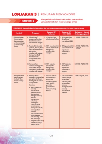 STRATEGI 3 Menyediakan infrastruktur dan perumahan yang selamat dan mesra warga emasInisiatifProgramSasaran KPI TahunanSasaran KPI 2025-2030Bahagian / Agensi Bertanggungjawab1.Menyediakan infrastruktur berpandukan universal design(Mesra warga emas)i.Menaiktaraf prasarana hentian bas berdasarkan rekabentuk sejagati.4 hentian bas dinaik taraf/tahuni.20 hentian bas dinaik taraf menjelang 2023i.DBKL, PPj, PL, PKBii.Pusat aktiviti sosial (taman, dewan, balai raya dll) memenuhi keperluan rekabentuk sejagat (ramp, handrail, tandas mesra warga emas dan lain-lain)ii.50% pusat aktiviti sosial memenuhi keperluan rekabentuk sejagatii.80% pusat aktiviti sosial memenuhi keperluan rekabentuk sejagatii.DBKL, PPj, PL, PKB, MSWPiii.Kemudahan infrastruktur jejantas dan %u2018linked bridge%u2019 mematuhi keperluan rekabentuk sejagatiii.70% jejantas mematuhi keperluan rekabentuk sejagatiii.100% jejantas mematuhi keperluan rekabentuk sejagatiii.DBKL, PPj, PL, PKB2.Menyediakan perumahan inklusif dan mesra warga emasi.Mewujudkan program perumahan yang kondusif dan berdaya huni untuk warga emasContoh:%u2022Menggalakkan konsep perumahan inklusif (MultiGeneration/Intergeneration) melalui penyediaan sekurang kurangnya 1% daripada keseluruhan bilangan rumah;%u2022Mewujudkan konsep perumahan 2 unit bertentangan untuk warga emas dan keluarga;%u2022Penyediaan ruang beraktiviti bagi warga emasi.50 unit rumah mesra warga emas dan melaksanakan satu projek perintis perumahan inklusif setiap tahun.i.500 unit rumah mesra warga emas dan memastikan perumahan baharu mengamalkan konsep perumahan inklusif.DBKL, PPj, PL, PKBMenyediakan infrastruktur dan perumahan yang selamat dan mesra warga emasStrategi 3LONJAKAN 5 PENUAAN MENYOKONG124