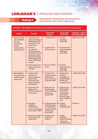 STRATEGI 3 Menyediakan infrastruktur dan perumahan yang selamat dan mesra warga emasInisiatifProgramSasaran KPI TahunanSasaran KPI 2025-2030Bahagian / Agensi Bertanggungjawab3.Merancang dan menambahbaik aset-aset keselamatan dengan menggunakan teknologi terkinii.Penyediaan alat Automated External Defibrillator (AED) di bangunan dan fasiliti awami.12 lokasi/tahuni.60 Lokasi menjelang tahun 2030DBKL, PPj, PL, PKBii.Pameran dan taklimat penggunaan alat Automated External Defibrillator (AED) kepada penduduk Projek Perumahan Rakyat (PPR) Kuala Lumpurii.2 pameran dan taklimat/tahunii.10 pameran dan taklimat diadakan menjelang tahun 2030iii.Pemasangan panicbutton di kawasan strategikiii.69 panicbutton/tahuniii.345 panicbutton dipasang menjelang tahun 20304.Meningkatkan akses transit dan mobiliti kepada warga emasi.Program Silver Park Zone di semua bangunan parkir awam serta pusat belibelah di Wilayah Persekutuani.10 lokasi SilverPark Zone baharu di bangunan parkir awam dan pusat beli-belahi.50 lokasi Silver Park Zonediwujudkan di seluruh Wilayah Persekutuan menjelang 2030i.DBKL, PPj, PL, PKBii.Parkir Percuma Warga Emas dikawasan Wilayah Persekutuanii.Parkir Percuma kepada warga emas di sekurangkurangnya 5 kawasan PBTii.100% kawasan PBT di Wilayah Persekutuan melaksanakan sistem parkir percuma warga emas menjelang 2030ii.DBKL, PPj, PL, PKBiii.Penjajaran rangkaian perkhidmatan awam mesra warga emas seperti GOKLiii.1 bilangan jajaran tambahan yang mengambil kira tempat strategik untuk warga emas/tahuniii.5 jajaran tambahan menjelang 2030iii.DBKL, PLiv.Pemberian pelekat kenderaan untuk warga emasiv.20,000 pelekat kenderaan setahuniv.100,000 pemberian pelekat kenderan warga emas menjelang 2030.iv.DBKL, PPj, PL, PKBMenyediakan infrastruktur dan perumahan yang selamat dan mesra warga emasStrategi 3LONJAKAN 5 PENUAAN MENYOKONG125