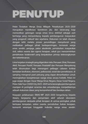 Pelan Tindakan Warga Emas Wilayah Persekutuan 2025%u20132030 merupakan manifestasi komitmen jitu dan terancang bagi memastikan golongan warga emas terus diiktiraf sebagai aset berharga yang menyumbang kepada pembangunan masyarakat yang progresif, inklusif dan sejahtera. Dokumen ini telah disusun dengan teliti melalui proses perundingan menyeluruh yang melibatkan pelbagai pihak berkepentingan, termasuk warga emas sendiri, penjaga, pakar akademik, pertubuhan masyarakat sivil, sektor swasta dan agensi kerajaan, sekali gus mencerminkan pendekatan kolaboratif yang berpaksikan prinsip keterangkuman dan keberkesanan.Lima lonjakan strategik yang digariskan iaitu Penuaan Sihat, Penuaan Aktif, Penuaan Positif, Penuaan Produktif dan Penuaan Menyokong telah dirumuskan bagi menangani pelbagai cabaran kritikal berkaitan kesihatan, ekonomi, psikososial, sosial dan persekitaran, di samping mengenal pasti peluang yang dapat dimanfaatkan untuk meningkatkan kesejahteraan warga emas secara holistik. Pelan ini juga sejajar dengan Dasar Warga Emas Negara, Dasar Sosial Negara, Pelan Hala Tuju CHASE City 2025%u20132029 serta kerangka pembangunan mampan di peringkat serantau dan antarabangsa, menjadikannya sebuah dokumen dasar yang komprehensif dan berdaya tahan.Kejayaan pelaksanaan EMAS-WP 2025%u20132030 bergantung kepada iltizam, kerjasama dan penyertaan aktif seluruh ekosistem pembangunan daripada pihak kerajaan di semua peringkat, pihak berkuasa tempatan, sektor swasta, pertubuhan bukan kerajaan, komuniti setempat hinggalah individu warga emas sendiri. PENUTUP134