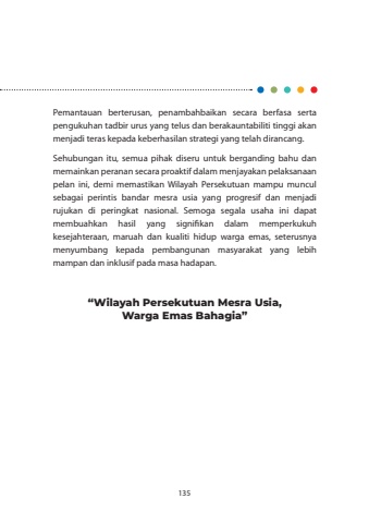 Pemantauan berterusan, penambahbaikan secara berfasa serta pengukuhan tadbir urus yang telus dan berakauntabiliti tinggi akan menjadi teras kepada keberhasilan strategi yang telah dirancang.Sehubungan itu, semua pihak diseru untuk berganding bahu dan memainkan peranan secara proaktif dalam menjayakan pelaksanaan pelan ini, demi memastikan Wilayah Persekutuan mampu muncul sebagai perintis bandar mesra usia yang progresif dan menjadi rujukan di peringkat nasional. Semoga segala usaha ini dapat membuahkan hasil yang signifikan dalam memperkukuh kesejahteraan, maruah dan kualiti hidup warga emas, seterusnya menyumbang kepada pembangunan masyarakat yang lebih mampan dan inklusif pada masa hadapan.%u201cWilayah Persekutuan Mesra Usia,Warga Emas Bahagia%u201d135
