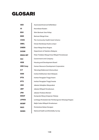 GLOSARIAEDAutomated External DefibrillatorAIKecerdasan BuatanBSHSkim Bantuan Sara HidupBWEBantuan Warga EmasCHASThe Community Health Assist SchemeDBKLDewan Bandaraya Kuala LumpurDWENDasar Warga Emas NegaraDOSMDepartment of Statistics MalaysiaEMAS-WPPelan Tindakan Warga Emas Wilayah PersekutuanGLCGovernment Link-CompanyHDBHousing and Development BoardHRD CorpHuman Resource Development CorporationICTTeknologi Maklumat & KomunikasiIKIMInstitut Kefahaman Islam MalaysiaIPTAInstitut Pengajian Tinggi AwamIPTSInstitut Pengajian Tinggi SwastaJKMJabatan Kebajikan MasyarakatJWPJabatan Wilayah PersekutuanJPMJabatan Perdana MenteriKWSPKumpulan Wang Simpanan PekerjaLPPKNLembaga Penduduk dan Pembangunan Keluarga NegaraMSWPMajlis Sukan Wilayah PersekutuanNGOPertubuhan Bukan KerajaanNHMSNational Health and Morbidity Survey138