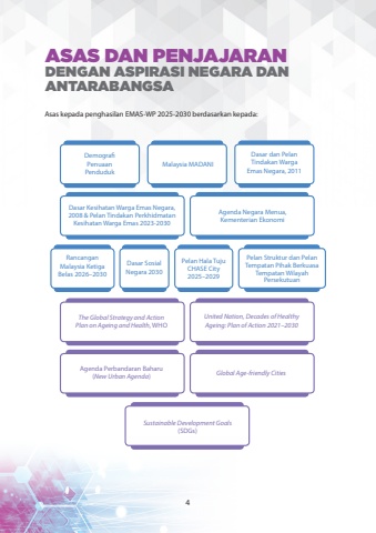 ASAS DAN PENJAJARAN DENGAN ASPIRASI NEGARA DAN ANTARABANGSAAsas kepada penghasilan EMAS-WP 2025-2030 berdasarkan kepada:Demografi Penuaan PendudukMalaysia MADANIDasar dan Pelan Tindakan Warga Emas Negara, 2011Dasar Kesihatan Warga Emas Negara, 2008 & Pelan Tindakan Perkhidmatan Kesihatan Warga Emas 2023-2030Agenda Negara Menua, Kementerian EkonomiDasar Sosial Negara 2030Rancangan Malaysia Ketiga Belas 2026%u20132030Pelan Hala TujuCHASE City 2025%u20132029Pelan Struktur dan Pelan Tempatan Pihak Berkuasa Tempatan Wilayah PersekutuanThe Global Strategy and Action Plan on Ageing and Health, WHOUnited Nation, Decades of Healthy Ageing: Plan of Action 2021%u20132030Agenda Perbandaran Baharu (New Urban Agenda)Global Age-friendly CitiesSustainable Development Goals(SDGs)4