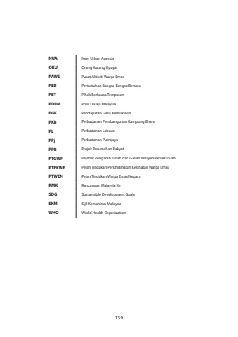 NUANew Urban AgendaOKUOrang Kurang UpayaPAWEPusat Aktiviti Warga EmasPBBPertubuhan Bangsa-Bangsa BersatuPBTPihak Berkuasa TempatanPDRMPolis DiRaja MalaysiaPGKPendapatan Garis KemiskinanPKBPerbadanan Pembangunan Kampong BharuPLPerbadanan LabuanPPjPerbadanan PutrajayaPPRProjek Perumahan RakyatPTGWPPejabat Pengarah Tanah dan Galian Wilayah PersekutuanPTPKWEPelan Tindakan Perkhidmatan Kesihatan Warga EmasPTWENPelan Tindakan Warga Emas NegaraRMKRancangan Malaysia KeSDGSustainable Development GoalsSKMSijil Kemahiran MalaysiaWHOWorld Health Organization139