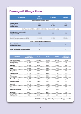SUMBER: Suruhanjaya Pilihan Raya Malaysia sehingga Julai 2025KAWASANPOPULASI WARGA EMAS60-6970-7980-8990 TAHUN DAN KE ATASKUALA LUMPUR278,644155,62489,19827,1536,670Wangsa Maju24,39915,1167,2931,694296Kepong26,79814,5978,8832,910408Batu23,16313,6477,0871,945484Segambut29,49216,1069,6962,949741Setiawangsa17,55211,1724,9391,171270Titiwangsa19,46511,4695,8081,630558Bukit Bintang30,60014,72910,5113,7441,616Lembah Pantai23,70113,4597,3122,359571Seputih31,94316,35310,9613,889740Cheras30,36416,05110,1563,386771Bandar Tun Razak21,16712,9256,5511,476215LABUAN8,0134,9612,311555186PUTRAJAYA4,5223,469965826PARAMETERKUALALUMPURPUTRAJAYALABUANTENAGA BURUH (DOSM, 2024)Tenaga buruh Warga Emas(60-64 tahun)27500(3.1%)400(1.1%)1700(3.5%)BANTUAN WARGA EMAS (JABATAN KEBAJIKAN MASYARAKAT, 2023)Bilangan penerima bantuan warga emas JKM3,35320258Jumlah bantuan warga emas (RM)19,482,700111,8001,500,000KELAB & PUSAT AKTIVITI WARGA EMASPusat Aktiviti Warga Emas (PAWE)1011Kelab Warga Emas (Klinik Kesihatan)521Demografi Warga Emas7