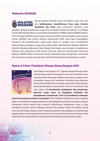 Konsep Malaysia MADANI yang menekankan enam nilai teras iaitu keMampanan, kesejAhteraan, Daya cipta, hormAt, keyakiNan dan Ihsan yang mempunyai perkaitan yang signifikan dengan kesejahteraan warga emas di Malaysia. Melalui pendekatan ini, pelbagai inisiatif telah diperkenalkan termasuk Bantuan Warga Emas (BWE) sebanyak RM600 sebulan, Skim Perubatan MADANI untuk rawatan percuma di klinik swasta berdaftar, serta Program Latihan MADANI oleh Human Resource Development (HRD Corp) bagi meningkatkan kemahiran dan kebolehpasaran warga emas. Selain itu, kerajaan turut memperkukuh profesionalisme penjagaan warga emas melalui latihan Sijil Kemahiran Malaysia (SKM) dan komited terhadap pelaksanaan Dasar Warga Emas Negara yang menjamin kesejahteraan, kesihatan dan penyertaan sosial mereka. Kesemua usaha ini mencerminkan komitmen Malaysia MADANI dalam membentuk sebuah masyarakat yang menghormati, melindungi dan memperkasa warga emas agar terus aktif dan dihargai dalam pembangunan negara.Dasar Warga Emas Negara 2011 digubal sebagai kerangka dasar utama kerajaan dalam menangani isu penuaan penduduk secara menyeluruh dan bersepadu. Objektif utama dasar ini adalah untuk memastikan warga emas menikmati kehidupan yang sejahtera, bermaruah, aktif dan dihormati dalam masyarakat, selaras dengan prinsip pembangunan yang inklusif. Dasar ini menekankan tiga teras utama: (1) keselamatan pendapatan dan penyertaan ekonomi warga emas, (2) penjagaan kesihatan dan kesejahteraan menyeluruh, serta (3) persekitaran sokongan sosial dan penyertaan dalam masyarakat. Pelan Tindakan Warga Emas yang mengiringi dasar ini merangkumi strategi pelaksanaan oleh pelbagai kementerian dan agensi, dengan pendekatan antara sektoral bagi menjamin keberkesanan pelaksanaan dasar. Ia juga mengiktiraf peranan institusi keluarga, komuniti dan kerajaan dalam memastikan warga emas terus berfungsi sebagai sumber tenaga, pengetahuan dan pengalaman yang berharga kepada negara. Secara keseluruhannya, dasar ini mencerminkan komitmen kerajaan untuk memastikan penuaan aktif dan menyokong dalam kerangka pembangunan negara.Malaysia MADANIDasar & Pelan Tindakan Warga Emas Negara 20118