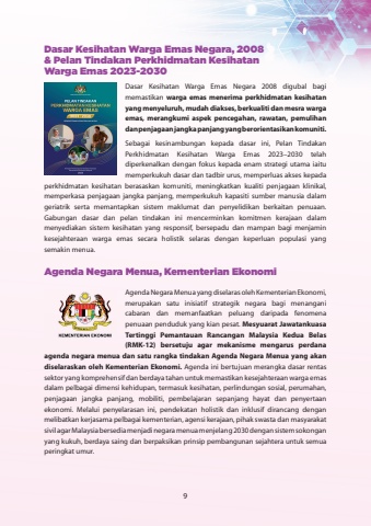 Dasar Kesihatan Warga Emas Negara 2008 digubal bagi memastikan warga emas menerima perkhidmatan kesihatan yang menyeluruh, mudah diakses, berkualiti dan mesra warga emas, merangkumi aspek pencegahan, rawatan, pemulihan dan penjagaan jangka panjang yang berorientasikan komuniti.Sebagai kesinambungan kepada dasar ini, Pelan Tindakan Perkhidmatan Kesihatan Warga Emas 2023%u20132030 telah diperkenalkan dengan fokus kepada enam strategi utama iaitu memperkukuh dasar dan tadbir urus, memperluas akses kepada perkhidmatan kesihatan berasaskan komuniti, meningkatkan kualiti penjagaan klinikal, memperkasa penjagaan jangka panjang, memperkukuh kapasiti sumber manusia dalam geriatrik serta memantapkan sistem maklumat dan penyelidikan berkaitan penuaan. Gabungan dasar dan pelan tindakan ini mencerminkan komitmen kerajaan dalam menyediakan sistem kesihatan yang responsif, bersepadu dan mampan bagi menjamin kesejahteraan warga emas secara holistik selaras dengan keperluan populasi yang semakin menua.Agenda Negara Menua yang diselaras oleh Kementerian Ekonomi, merupakan satu inisiatif strategik negara bagi menangani cabaran dan memanfaatkan peluang daripada fenomena penuaan penduduk yang kian pesat. Mesyuarat Jawatankuasa Tertinggi Pemantauan Rancangan Malaysia Kedua Belas (RMK-12) bersetuju agar mekanisme mengarus perdana agenda negara menua dan satu rangka tindakan Agenda Negara Menua yang akan diselaraskan oleh Kementerian Ekonomi. Agenda ini bertujuan merangka dasar rentas sektor yang komprehensif dan berdaya tahan untuk memastikan kesejahteraan warga emas dalam pelbagai dimensi kehidupan, termasuk kesihatan, perlindungan sosial, perumahan, penjagaan jangka panjang, mobiliti, pembelajaran sepanjang hayat dan penyertaan ekonomi. Melalui penyelarasan ini, pendekatan holistik dan inklusif dirancang dengan melibatkan kerjasama pelbagai kementerian, agensi kerajaan, pihak swasta dan masyarakat sivil agar Malaysia bersedia menjadi negara menua menjelang 2030 dengan sistem sokongan yang kukuh, berdaya saing dan berpaksikan prinsip pembangunan sejahtera untuk semua peringkat umur.Dasar Kesihatan Warga Emas Negara, 2008 & Pelan Tindakan Perkhidmatan Kesihatan Warga Emas 2023-2030Agenda Negara Menua, Kementerian Ekonomi9