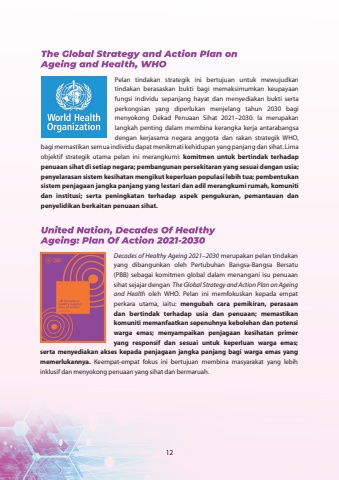 Pelan tindakan strategik ini bertujuan untuk mewujudkan tindakan berasaskan bukti bagi memaksimumkan keupayaan fungsi individu sepanjang hayat dan menyediakan bukti serta perkongsian yang diperlukan menjelang tahun 2030 bagi menyokong Dekad Penuaan Sihat 2021%u20132030. Ia merupakan langkah penting dalam membina kerangka kerja antarabangsa dengan kerjasama negara anggota dan rakan strategik WHO, bagi memastikan semua individu dapat menikmati kehidupan yang panjang dan sihat. Lima objektif strategik utama pelan ini merangkumi: komitmen untuk bertindak terhadap penuaan sihat di setiap negara; pembangunan persekitaran yang sesuai dengan usia; penyelarasan sistem kesihatan mengikut keperluan populasi lebih tua; pembentukan sistem penjagaan jangka panjang yang lestari dan adil merangkumi rumah, komuniti dan institusi; serta peningkatan terhadap aspek pengukuran, pemantauan dan penyelidikan berkaitan penuaan sihat.Decades of Healthy Ageing 2021%u20132030 merupakan pelan tindakan yang dibangunkan oleh Pertubuhan Bangsa-Bangsa Bersatu (PBB) sebagai komitmen global dalam menangani isu penuaan sihat sejajar dengan The Global Strategy and Action Plan on Ageing and Health oleh WHO. Pelan ini memfokuskan kepada empat perkara utama, iaitu: mengubah cara pemikiran, perasaan dan bertindak terhadap usia dan penuaan; memastikan komuniti memanfaatkan sepenuhnya kebolehan dan potensi warga emas; menyampaikan penjagaan kesihatan primer yang responsif dan sesuai untuk keperluan warga emas; serta menyediakan akses kepada penjagaan jangka panjang bagi warga emas yang memerlukannya. Keempat-empat fokus ini bertujuan membina masyarakat yang lebih inklusif dan menyokong penuaan yang sihat dan bermaruah.12