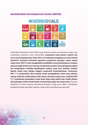 Sustainable Development Goals (SDGs) yang berkaitan dengan pemerkasaan warga emas menekankan keperluan untuk mewujudkan masyarakat yang inklusif, selamat dan mesra usia menjelang tahun 2030. SDG 2.2 menekankan penghapusan semua bentuk malnutrisi, termasuk memenuhi keperluan pemakanan golongan rentan seperti warga emas. SDG 4.7 pula menggalakkan pendidikan untuk pembangunan mampan yang merangkumi hak asasi manusia, kesaksamaan jantina, kewarganegaraan global dan penghargaan terhadap kepelbagaian budaya, yang turut memberi manfaat kepada warga emas sebagai anggota masyarakat berpengetahuan. Seterusnya, SDG 11.2 menyasarkan akses kepada sistem pengangkutan awam yang selamat, mampu milik dan mudah diakses oleh semua, termasuk warga emas, manakala SDG 11.7 menekankan penyediaan ruang awam hijau yang inklusif dan mudah diakses oleh golongan wanita, kanak-kanak, orang kurang upaya dan warga emas. Kesemua matlamat ini secara langsung menyokong keperluan warga emas dalam mewujudkan persekitaran hidup yang lebih sejahtera, selamat dan menyokong penuaan aktif.14