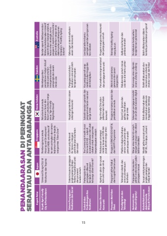 PENANDAARASANDI PERINGKAT SERANTAU DAN ANTARABANGSAAspek PolisiJepunSingapuraKorea SelatanSwedenAustraliaAspek Age-FriendlyCity & Perbandaran%u2018Universal Design City%u2019 diYokohama dan ToyamaPembangunan semula Housing and Development Board (HDB) untuk akses lif ke semua tingkat dan taman kejiranan berfokus kepada warga emas %u201cSilver Zone%u201dReka bentuk semulakejiranan Seoul dan Busan untuk akses warga emas %u201dAge-Friendly Neighbourhoods%u201dMembangunkanpersekitaran hidup inklusif melalui perumahan intergenerational dan pengangkutan awam mesra usiaBandar seperti Melbourne danBrisbane melaksanakan inisiatif seperti laluan berjalan selamat, kerusi rehat strategik, serta program %u2018Liveable Communities%u2019 yang melibatkan warga emas dalam pelan pembangunan tempatan. %u201cHealthy Ageing Suburbs%u201dSistem Penjagaan Kesihatan dan SosialSistem insurans penjagaan jangka panjang (Kaigo Hoken), hospital komuniti dan jururawat lawatan rumahCommunity Network for Seniors, integrasi perkhidmatan kesihatan dan sosialHospital geriatrik dan sistem sokongan komunitiPenjagaan sosial dan kesihatan universal oleh kerajaan tempatanGabungan sistem kesihatan awam dan komunitiSubsidi dan Perlindungan Kos KesihatanPerkongsian kos penjagaan dikawal kerajaan; sokongan keluarga diberi insentifThe Community Health Assist Scheme (CHAS) %u2013 subsidi rawatan perubatan dan ubat-ubatan untuk warga emasberpendapatan rendahSubsidi rawatan geriatrik dan program kesihatan nasional warga emasKos penjagaan diserap melalui cukai tinggi dan skim kebajikanLiveUp platform bantu saringan awal dan pengurusan kos rawatanPenuaan BerasaskanKomunitiAgeing-in-place dan pusat komuniti warga emasPelaksanaan setempat melalui kawasan HDB dan pusat aktiviti warga emasAge-Friendly Cities dan pelaksanaan kesihatankomunitiPerumahan intergenerationaldan penjagaan komunitiProgram warga emas komuniti dan penjagaan rumahPenuaan Aktif dan SihatProgram latihan fizikal dan kognitif berterusanProgram SENIORS GO DIGITAL dan HAPPY ProgrammeProgram senaman senior dan pendidikan semulaAktiviti sosial antara generasi dan pusat warga emasStrategi Healthy AgeingmenyeluruhPendigitalan dan TeknologiTeknologi robotik dan sensor pemantauan kesihatanPlatform digital kesihatan, sensor rumah pintar danpemantauan mandiriSmart Care System dan aplikasi kesihatan warga emasRekabentuk rumah mesra usia dan alat bantu pintarAplikasi kesihatan dan penilaian kendiriAutonomi danMaruah (Dignity)Penjagaan berasaskan pilihan individu dan pelan penjagaan tersuaiWarga emas kekal di rumah dengan sokongan dan diberi latihan berdikariSokongan penjagaan kendiri di rumah dan kawalan digitalHak warga emas dijamin secara undang-undangPendekatan berdasarkan kesejahteraan psikososialKebolehlaksanaan dalam konteks Wilayah PersekutuanSesuai untuk perancangan jangka panjang dan wilayah bandarModel paling sesuai untuk WP (KL, Putrajaya, Labuan)Boleh dilaksanakan dan memerlukan pelaburan tinggi dalam teknologiBoleh dilaksanakan dan memerlukan reformasi struktur sosial dan fiskalBoleh dilaksanakan dalam konteks perbandaran progresif15