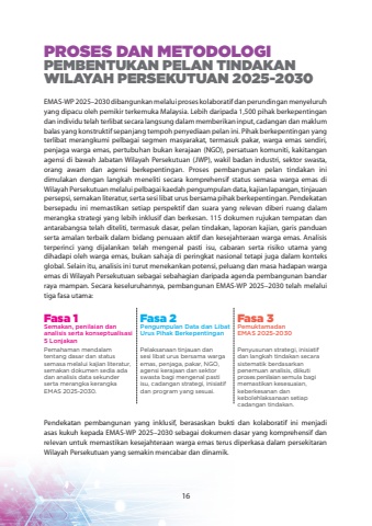PROSES DAN METODOLOGI PEMBENTUKAN PELAN TINDAKAN WILAYAH PERSEKUTUAN 2025-2030EMAS-WP 2025%u20132030 dibangunkan melalui proses kolaboratif dan perundingan menyeluruh yang dipacu oleh pemikir terkemuka Malaysia. Lebih daripada 1,500 pihak berkepentingan dan individu telah terlibat secara langsung dalam memberikan input, cadangan dan maklum balas yang konstruktif sepanjang tempoh penyediaan pelan ini. Pihak berkepentingan yang terlibat merangkumi pelbagai segmen masyarakat, termasuk pakar, warga emas sendiri, penjaga warga emas, pertubuhan bukan kerajaan (NGO), persatuan komuniti, kakitangan agensi di bawah Jabatan Wilayah Persekutuan (JWP), wakil badan industri, sektor swasta, orang awam dan agensi berkepentingan. Proses pembangunan pelan tindakan ini dimulakan dengan langkah meneliti secara komprehensif status semasa warga emas di Wilayah Persekutuan melalui pelbagai kaedah pengumpulan data, kajian lapangan, tinjauan persepsi, semakan literatur, serta sesi libat urus bersama pihak berkepentingan. Pendekatan bersepadu ini memastikan setiap perspektif dan suara yang relevan diberi ruang dalam merangka strategi yang lebih inklusif dan berkesan. 115 dokumen rujukan tempatan dan antarabangsa telah diteliti, termasuk dasar, pelan tindakan, laporan kajian, garis panduan serta amalan terbaik dalam bidang penuaan aktif dan kesejahteraan warga emas. Analisis terperinci yang dijalankan telah mengenal pasti isu, cabaran serta risiko utama yang dihadapi oleh warga emas, bukan sahaja di peringkat nasional tetapi juga dalam konteks global. Selain itu, analisis ini turut menekankan potensi, peluang dan masa hadapan warga emas di Wilayah Persekutuan sebagai sebahagian daripada agenda pembangunan bandar raya mampan. Secara keseluruhannya, pembangunan EMAS-WP 2025%u20132030 telah melalui tiga fasa utama:Pendekatan pembangunan yang inklusif, berasaskan bukti dan kolaboratif ini menjadi asas kukuh kepada EMAS-WP 2025%u20132030 sebagai dokumen dasar yang komprehensif dan relevan untuk memastikan kesejahteraan warga emas terus diperkasa dalam persekitaran Wilayah Persekutuan yang semakin mencabar dan dinamik.Fasa 1Semakan, penilaian dan analisis serta konseptualisasi 5 LonjakanFasa 2Pengumpulan Data dan Libat Urus Pihak BerkepentinganFasa 3PemuktamadanEMAS 2025-2030Pemahaman mendalam tentang dasar dan status semasa melalui kajian literatur, semakan dokumen sedia ada dan analisis data sekunder serta merangka kerangka EMAS 2025-2030.Pelaksanaan tinjauan dan sesi libat urus bersama warga emas, penjaga, pakar, NGO, agensi kerajaan dan sektor swasta bagi mengenal pasti isu, cadangan strategi, inisiatif dan program yang sesuai.Penyusunan strategi, inisiatif dan langkah tindakan secara sistematik berdasarkan penemuan analisis, diikuti proses penilaian semula bagi memastikan kesesuaian, keberkesanan dan kebolehlaksanaan setiap cadangan tindakan.16