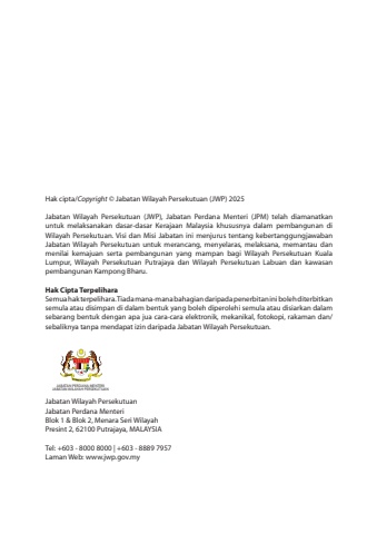 Hak cipta/Copyright %u00a9 Jabatan Wilayah Persekutuan (JWP) 2025Jabatan Wilayah Persekutuan (JWP), Jabatan Perdana Menteri (JPM) telah diamanatkan untuk melaksanakan dasar-dasar Kerajaan Malaysia khususnya dalam pembangunan di Wilayah Persekutuan. Visi dan Misi Jabatan ini menjurus tentang kebertanggungjawaban Jabatan Wilayah Persekutuan untuk merancang, menyelaras, melaksana, memantau dan menilai kemajuan serta pembangunan yang mampan bagi Wilayah Persekutuan Kuala Lumpur, Wilayah Persekutuan Putrajaya dan Wilayah Persekutuan Labuan dan kawasan pembangunan Kampong Bharu.Hak Cipta TerpeliharaSemua hak terpelihara. Tiada mana-mana bahagian daripada penerbitan ini boleh diterbitkan semula atau disimpan di dalam bentuk yang boleh diperolehi semula atau disiarkan dalam sebarang bentuk dengan apa jua cara-cara elektronik, mekanikal, fotokopi, rakaman dan/sebaliknya tanpa mendapat izin daripada Jabatan Wilayah Persekutuan.JABATAN PERDANA MENTERIJABATAN WILAYAH PERSEKUTUANJabatan Wilayah Persekutuan Jabatan Perdana MenteriBlok 1 & Blok 2, Menara Seri WilayahPresint 2, 62100 Putrajaya, MALAYSIATel: +603 - 8000 8000 | +603 - 8889 7957Laman Web: www.jwp.gov.my