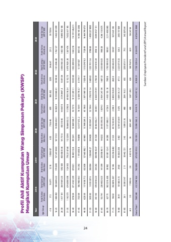 Sumber: Employees Provident Fund (EPF) Annual ReportProfil Ahli Aktif Kumpulan Wang Simpanan Pekerja (KWSP) Mengikut Kumpulan UmurYear201820192020202120222023Age GroupTotal Active MembersTotal Savings (MYR %u2018000)Total Active MembersTotal Savings (MYR %u2018000)Total Active MembersTotal Savings (MYR %u2018000)Total Active MembersTotal Savings (MYR %u2018000)Total Active MembersTotal Savings (MYR %u2018000)Total Active MembersTotal Savings (MYR %u2018000)<1617396.97112181058.087605719.648699965.83232933466.472312597359616-25148440210026496.32179634515724769.83167315014450669.81163825410310060.45185904211014346.8817621271442283109926-30141718136491695.35139258345045881.46141751645031046144547835748447.6156910434940183.8316021084089395310831-35114257367465909.98112493377823187.68112529878666403.32113783869959318.34121527369707629.3812674767633261718536-4087360487141633.9987482198482152.8893241103669568.7927270101212091.11003360105228590.81042218114191168,65141-45733309106748304.3741392119169358748098126177672.2761549125047783.781741713134783784316514346145530646-50622030117813877.2632838127665982.1639681137690269.5651960139719691.8702845151507478.371284916464799675151-55503583101352076506004103684527508428112039547.7521944117659151.4568963132570113.657886814930227885056-6034314347850186.3333420250099043.4734722058464456.2136043165633574.9937065975599210.043936128694815715161-6515374122840528.3314159923005840.1114823226435595.9815074329541247.9416873335358590.031900284266113387566-70627759633210.6585898210108112.416428011971989.316726014181155.187909817959999.59900812211439288571-75196023928876.057181464102568.482215234973283.945239835805359.869282507205602.00533487927262518576-8038411018654.152960956560.33434021294167.64936761694134.12747132223077.9235242243573706981-8526155081.94721150442.721343109931.16480204119.53655329387.911793543207564>85307390.96284431.076366041.44740812471.38362616879.67660915624784Grand Total7360248612374018.67626262675923915.57591053720981362.57691973716729573.28392031775012393.4852497586724915306024