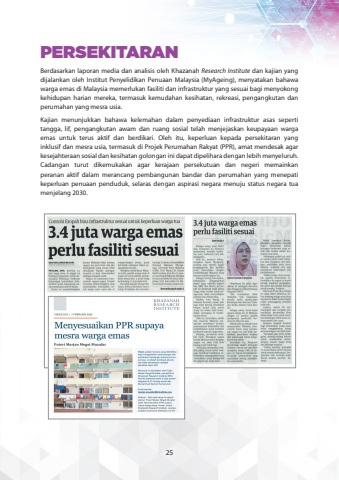 PERSEKITARANBerdasarkan laporan media dan analisis oleh Khazanah Research Institute dan kajian yang dijalankan oleh Institut Penyelidikan Penuaan Malaysia (MyAgeing), menyatakan bahawa warga emas di Malaysia memerlukan fasiliti dan infrastruktur yang sesuai bagi menyokong kehidupan harian mereka, termasuk kemudahan kesihatan, rekreasi, pengangkutan dan perumahan yang mesra usia.Kajian menunjukkan bahawa kelemahan dalam penyediaan infrastruktur asas seperti tangga, lif, pengangkutan awam dan ruang sosial telah menjejaskan keupayaan warga emas untuk terus aktif dan berdikari. Oleh itu, keperluan kepada persekitaran yang inklusif dan mesra usia, termasuk di Projek Perumahan Rakyat (PPR), amat mendesak agar kesejahteraan sosial dan kesihatan golongan ini dapat dipelihara dengan lebih menyeluruh. Cadangan turut dikemukakan agar kerajaan persekutuan dan negeri memainkan peranan aktif dalam merancang pembangunan bandar dan perumahan yang menepati keperluan penuaan penduduk, selaras dengan aspirasi negara menuju status negara tua menjelang 2030.25