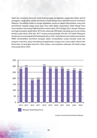 Salah satu intervensi komuniti untuk kelangsungan penglibatan masyarakat dalam aktiviti penjagaan warga emas adalah penubuhan Kelab Warga Emas oleh Kementerian Kesihatan Malaysia. Penubuhan kelab ini sangat digalakkan kerana ia dapat menyediakan ruang dan persekitaran kepada warga emas agar terus aktif dalam masyarakat. Kelab Warga Emas menunjukkan trend yang tidak konsisten antara tahun 2014 hingga 2022, dengan bilangan tertinggi dicatatkan pada tahun 2018 iaitu sebanyak 296 kelab, manakala penurunan ketara berlaku pada tahun 2016 dan 2017 masing-masing kepada 224 dan 233 kelab. Walaupun berlaku penurunan kepada 265 kelab pada tahun 2022, usaha berterusan melalui penubuhan PAWE membuktikan komitmen kerajaan dalam menyediakan ruang interaksi sosial dan program intervensi yang menyokong kesejahteraan warga emas secara lebih inklusif dan berstruktur di peringkat komuniti. Data terbaru menunjukkan sebanyak 256 kelab warga emas pada tahun 2024.05010015020025030035020142702017233202028420152852018296202128420162242019284202220232024265267256Bilangan Kelab Warga EmasSumber: Kementerian Kesihatan Malaysia28