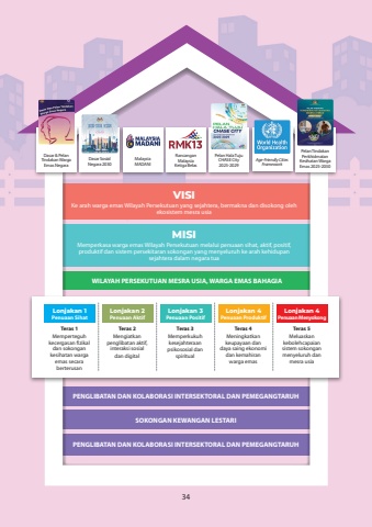 WILAYAH PERSEKUTUAN MESRA USIA, WARGA EMAS BAHAGIAPENGLIBATAN DAN KOLABORASI INTERSEKTORAL DAN PEMEGANGTARUHSOKONGAN KEWANGAN LESTARIPENGLIBATAN DAN KOLABORASI INTERSEKTORAL DAN PEMEGANGTARUHMISIMemperkasa warga emas Wilayah Persekutuan melalui penuaan sihat, aktif, positif, produktif dan sistem persekitaran sokongan yang menyeluruh ke arah kehidupan sejahtera dalam negara tuaVISIKe arah warga emas Wilayah Persekutuan yang sejahtera, bermakna dan disokong oleh ekosistem mesra usiaPelan Hala Tuju CHASE City 2025-2029Dasar & Pelan Tindakan Warga Emas NegaraPelan Tindakan Perkhidmatan Kesihatan Warga Emas 2025-2030Lonjakan 1Penuaan SihatLonjakan 2Penuaan AktifLonjakan 3Penuaan PositifLonjakan 4Penuaan ProduktifLonjakan 4Penuaan MenyokongTeras 1Memperteguh kecergasan fizikal dan sokongan kesihatan warga emas secara berterusanTeras 2Mengiatkan penglibatan aktif, interaksi sosial dan digitalTeras 3Memperkukuhkesejahteraan psikososial dan spiritualTeras 4Meningkatkan keupayaan dan daya saing ekonomi dan kemahiran warga emasTeras 5Meluaskan kebolehcapaian sistem sokongan menyeluruh dan mesra usiaDasar Sosial Negara 2030Age-Friendly CitiesFrameworkMalaysiaMADANIRancangan Malaysia Ketiga Belas34