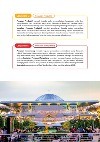 Lonjakan 4Penuaan ProduktifPenuaan Produktif merujuk kepada usaha meningkatkan keupayaan serta daya saing ekonomi dan kemahiran warga emas, berteraskan keyakinan bahawa mereka masih mampu menyumbang secara bermakna kepada pembangunan negara. Justeru, Lonjakan Penuaan Produktif memberi penekanan kepada usaha memastikan warga emas kekal produktif, berdikari dan terus menyumbang kepada ekonomi dan masyarakat melalui penyertaan dalam pekerjaan, keusahawanan, ekonomi komuniti, serta aktiviti kebudayaan dan kesenian yang mempunyai nilai ekonomi.Lonjakan 5Penuaan MenyokongPenuaan menyokong merujuk kepada penyediaan persekitaran yang kondusif, inklusif dan mesra usia menerusi sistem sokongan yang menyeluruh dan bersepadu, bagi memastikan warga emas dapat menua secara optimum, dihargai dan dilindungi. Justeru, Lonjakan Penuaan Menyokong memberi tumpuan kepada pembangunan sistem sokongan yang menyeluruh dan mesra warga emas, dengan sasaran sekurangkurangnya satu kawasan atau parlimen di Wilayah Persekutuan diiktiraf sebagai Bandar Mesra Usia yang selamat, inklusif dan berdaya tahan menjelang tahun 2030.38