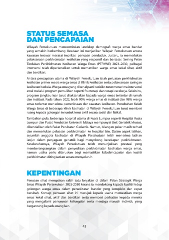 STATUS SEMASA DAN PENCAPAIANWilayah Persekutuan mencerminkan landskap demografi warga emas bandar yang semakin berkembang. Keadaan ini menjadikan Wilayah Persekutuan antara kawasan terawal merasai implikasi penuaan penduduk. Justeru, ia memerlukan pelaksanaan perkhidmatan kesihatan yang responsif dan bersasar. Seiring Pelan Tindakan Perkhidmatan Kesihatan Warga Emas (PTPKWE) 2023%u20132030, pelbagai intervensi telah diperkenalkan untuk memastikan warga emas kekal sihat, aktif dan berdikari.Antara pencapaian utama di Wilayah Persekutuan ialah peluasan perkhidmatan kesihatan primer mesra warga emas di Klinik Kesihatan serta pelaksanaan saringan kesihatan berkala. Warga emas yang dikenal pasti berisiko turut menerima intervensi awal melalui program pemulihan seperti fisioterapi dan terapi carakerja. Selain itu, program jangkau luar turut dilaksanakan kepada warga emas terlantar di rumah dan institusi. Pada tahun 2022, lebih 95% warga emas di institusi dan 98% warga emas terlantar menerima pemeriksaan dan rawatan kesihatan. Penubuhan Kelab Warga Emas di beberapa klinik kesihatan di Wilayah Persekutuan turut memberi ruang kepada golongan ini untuk terus aktif secara sosial dan fizikal.Tambahan pula, beberapa hospital utama di Kuala Lumpur seperti Hospital Kuala Lumpur dan Pusat Perubatan Universiti Malaya mempunyai Unit Geriatrik khusus, dikendalikan oleh Pakar Perubatan Geriatrik. Namun, bilangan pakar masih terhad dan memerlukan peluasan perkhidmatan ke hospital lain. Dalam aspek latihan, sejumlah anggota kesihatan di Wilayah Persekutuan telah menerima latihan lanjut dalam penjagaan geriatrik bagi menyokong kecekapan perkhidmatan. Keseluruhannya, Wilayah Persekutuan telah menunjukkan prestasi yang memberangsangkan dalam penyediaan perkhidmatan kesihatan warga emas, namun usaha perlu diteruskan bagi memastikan kebolehcapaian dan kualiti perkhidmatan ditingkatkan secara menyeluruh.KEPENTINGANPenuaan sihat merupakan salah satu lonjakan di dalam Pelan Strategik Warga Emas Wilayah Persekutuan 2025-2030 kerana ia mendokong kepada kualiti hidup golongan warga emas dalam persekitaran bandar yang kompleks dan cepat berubah. Konsep penuaan sihat ini merujuk kepada usaha memastikan warga emas kekal sihat, aktif dan berdikari serta memberi perhatian kepada mereka yang mengalami penurunan kefungsian serta menjaga maruah individu yang bergantung kepada orang lain.43