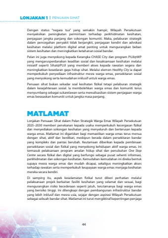 MATLAMATLonjakan Penuaan Sihat dalam Pelan Strategik Warga Emas Wilayah Persekutuan 2025%u20132030 memberi penekanan kepada usaha memperkukuh kecergasan fizikal dan menyediakan sokongan kesihatan yang menyeluruh dan berterusan kepada warga emas. Matlamat ini digariskan bagi memastikan warga emas terus menua dengan sihat, aktif dan berdikari, meskipun berada dalam persekitaran bandar yang kompleks dan pantas berubah. Keutamaan diberikan kepada pembinaan persekitaran sosial dan fizikal yang menyokong kehidupan aktif warga emas. Ini termasuk pelaksanaan program amalan hidup sihat dan penubuhan One Stop Centre secara fizikal dan digital yang berfungsi sebagai pusat sehenti informasi, perkhidmatan dan sokongan kesihatan. Kemudahan-kemudahan ini direka bentuk supaya mesra warga emas dan mudah dicapai, sekaligus meningkatkan akses terhadap rawatan serta memperkukuh keupayaan warga emas menjaga kesihatan mereka secara kendiri.Di samping itu, aspek keselamatan fizikal turut diberi perhatian melalui pelaksanaan projek berkaitan fasiliti kesihatan yang selamat dan sesuai, bagi mengurangkan risiko kecederaan seperti jatuh, terutamanya bagi warga emas yang berisiko tinggi. Ini dilengkapi dengan pembangunan infrastruktur bandar yang lebih inklusif dan mesra usia, sejajar dengan aspirasi Wilayah Persekutuan sebagai sebuah bandar sihat. Matlamat ini turut mengiktiraf kepentingan penjaga Dengan status %u201cnegara tua%u201d yang semakin hampir, Wilayah Persekutuan menyaksikan peningkatan permintaan terhadap perkhidmatan kesihatan, penjagaan jangka panjang dan sokongan komuniti. Maka, pelaburan strategik dalam pencegahan penyakit tidak berjangkit, penjagaan kendiri dan advokasi kesihatan melalui platform digital amat penting untuk mengurangkan beban sistem kesihatan dan meningkatkan ketahanan sosial bandar.Pelan ini juga menyokong kepada Kerangka CHASE City dan program PUJI@WP yang mengarusperdanakan keadilan sosial dan kesaksamaan kesihatan melalui inisiatif seperti Sihat@PUJI yang memberi akses kepada rawatan segera dan meningkatkan kesedaran gaya hidup sihat. Melalui elemen Healthy City ia dapat memperkukuh penyediaan infrastruktur mesra warga emas, persekitaran sosial yang menyokong serta kemudahan inklusif untuk warga emas.Penuaan sihat bukan sekadar soal kesihatan fizikal tetapi pelaburan strategik dalam kesejahteraan sosial. Ia membolehkan warga emas dan komuniti terus menyumbang sebagai sukarelawan serta merealisasikan sistem penjagaan warga emas berasaskan komuniti untuk jangka masa panjang.LONJAKAN 1 PENUAAN SIHAT44
