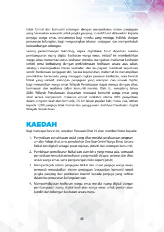 KAEDAHBagi mencapai hasrat ini, Lonjakan Penuaan Sihat ini akan memberi fokus kepada:1.Penyediaan persekitaran sosial yang sihat melalui pelaksanaan program amalan hidup sihat serta penubuhan One Stop Centre Warga Emas (secara fizikal dan digital) sebagai pusat rujukan, aktiviti dan sokongan komuniti;2.Pembinaan persekitaran fizikal dan alam bina yang mesra usia, termasuk penyediaan kemudahan kesihatan yang mudah dicapai, selamat dan sihat untuk warga emas, serta pengurangan risiko seperti jatuh;3.Memperteguh sistem penjagaan fizikal dan sosial penjaga warga emas, termasuk mewujudkan sistem penjagaan berasaskan komuniti untuk jangka panjang dan pemberian insentif kepada penjaga yang terlibat dalam kes penurunan kefungsian; dan4.Memperhebatkan kesihatan warga emas melalui ruang digital dengan pembangunan ruang digital kesihatan warga emas untuk pemantauan kendiri dan sokongan kesihatan secara maya.tidak formal dan komuniti sokongan dengan menyediakan sistem penjagaan yang berasaskan komuniti untuk jangka panjang. Insentif turut ditawarkan kepada penjaga warga emas, terutamanya bagi mereka yang menjaga individu dengan penurunan kefungsian, bagi mengurangkan tekanan penjagaan dan memperkukuh kesinambungan sokongan.Seiring perkembangan teknologi, aspek digitalisasi turut diperluas melalui pembangunan ruang digital kesihatan warga emas. Inisiatif ini membolehkan warga emas memantau status kesihatan mereka, mengakses maklumat kesihatan terkini serta berhubung dengan perkhidmatan kesihatan secara atas talian, sekaligus meningkatkan literasi kesihatan dan keupayaan membuat keputusan sendiri berkenaan penjagaan diri. Secara keseluruhan, matlamat ini menampilkan pendekatan bersepadu yang menggabungkan promosi kesihatan, reka bentuk fizikal yang inklusif, sokongan penjagaan yang mampan dan inovasi digital, bagi memastikan warga emas Wilayah Persekutuan dapat menua dengan sihat, bermaruah dan sejahtera dalam komuniti mereka. Oleh itu, menjelang tahun 2030, Wilayah Persekutuan disasarkan mencapai komuniti warga emas yang sihat secara menyeluruh menerusi empat indikator utama: 80% penyertaan dalam program kesihatan komuniti, 7.5 km laluan pejalan kaki mesra usia, latihan kepada 1,000 penjaga tidak formal dan penggunaan dashboard kesihatan digital Wilayah Persekutuan.45