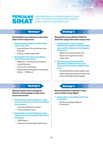 PENUAAN SIHATMEMPERTEGUH KECERGASAN FIZIKAL DAN SOKONGAN KESIHATAN WARGA EMAS SECARA BERTERUSANStrategi 1Strategi 3Strategi 2Strategi 4Menyediakan persekitaran sosial yang sihat untuk warga emasMemperteguh sistem penjagaan fizikal & sosial penjaga warga emas secara berterusanMenyediakan persekitaran fizikal & alam bina yang sihat untuk warga emasMemperhebatkan kesihatan warga emas melalui ruang digital1.Melaksanakan program amalan hidup sihat warga emas%u2022Bakul kesihatan/ kit pemeriksaan asas kesihatan%u2022Program amalan hidup sihat2.Mewujudkan One Stop Centre Warga Emas (Fizikal dan Online)%u2022EMASCare %u2013 One Stop Centre khidmat nasihat kesihatan%u2022Promosi One Stop Centre%u2022Khidmat Nasihat Kesihatan secara talian telefon %u2013 %u201cEMASLine%u201d1.Menyediakan sistem penjagaan warga emas berasaskan komuniti untuk jangka masa panjang%u2022Community Network for Seniors%u2022Latihan kesihatan emas2.Menyediakan insentif kepada penjaga warga emas yang mengalami penurunan kefungsian%u2022%u201cEMASJagaku%u201d%u2022Program insentif penjaga tidak formal1.Melaksanakan program/ projek berkaitan kemudahan fasiliti kesihatan yang mudah sampai dan sihat kepada warga emas%u2022Wellness Hub mesra warga emas%u2022Kerusi rehat ergonomik untuk warga emas2.Melaksanakan projek berkaitan kemudahan fasiliti kesihatan yang selamat & sesuai bagi mengelak risiko jatuh%u2022Penambahbaikkan laluan pejalan kaki%u2022Jalinan kerjasama dengan pemaju untuk reka bentuk fasiliti tanpa halangan1.Mewujudkan ruang digital Kesihatan warga emas.%u2022Dashbord Kesihatan Wilayah Persekutuan47