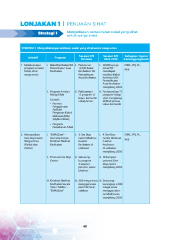 LONJAKAN 1 PENUAAN SIHATSTRATEGI 1 Menyediakan persekitaran sosial yang sihat untuk warga emasInisiatifProgramSasaran KPI TahunanSasaran KPI 2025-2030Bahagian / Agensi Bertanggungjawab1.Melaksanakan program amalan hidup sihat warga emasi.Bakul Kesihatan/Kit Pemeriksaan Asas Kesihatani.Pemberian10,000 Bakul Kesihatan/ Kit Pemeriksaan Asas Kesihatani.50,000 warga emas WP mendapat manfaat Bakul Kesihatan/Kit Pemeriksaan Asas Kesihatan menjelang 2030DBKL, PPj, PL,PKBii.Program Amalan Hidup SihatContoh:%u2022Promosi Penggunaan Aplikasi Pengiraan Kalori Makanan KKM (MyNutriDiari);%u2022Program Pemakanan Sihatii.Pelaksanaan 13 program di lokasi komuniti setiap tahunii.Pelaksanakan 70 program hidup sihat menjelang 2030 di semua lokasi komuniti2.Mewujudkan One Stop CentreWarga Emas (Fizikal dan Online)i.%u201cEMASCare%u201d %u2013 One Stop CentreKhidmat Nasihat Kesihatani.3 One Stop Centre Khidmat Nasihat Kesihatan di sediakani.4 One Stop Centre Khidmat Nasihat Kesihatan di sediakan menjelang 2030DBKL, PPj, PL,PKBii.Promosi One Stop Centre.ii.Sekurangkurangnya 2 kempen promosi pusat khidmatii.10 kempen promosi One Stop Centremenjelang 2030iii.Khidmat Nasihat Kesihatan Secara Talian Telefon %u2013 %u201cEMASLine%u201diii.500 warga emas menggunakan perkhidmatan setahuniii.Sekurangkurangnya 2,000 warga emas menggunakan perkhidmatan menjelang 2030Menyediakan persekitaran sosial yang sihat untuk warga emasStrategi 148