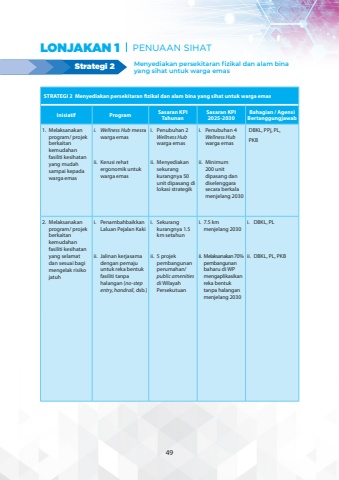 LONJAKAN 1 PENUAAN SIHATSTRATEGI 2 Menyediakan persekitaran fizikal dan alam bina yang sihat untuk warga emasInisiatifProgramSasaran KPI TahunanSasaran KPI 2025-2030Bahagian / Agensi Bertanggungjawab1.Melaksanakan program/ projek berkaitan kemudahan fasiliti kesihatan yang mudah sampai kepada warga emasi.Wellness Hub mesra warga emasi.Penubuhan 2 Wellness Hubwarga emasi.Penubuhan 4 Wellness Hubwarga emasDBKL, PPj, PL,PKBii.Kerusi rehat ergonomik untuk warga emasii.Menyediakan sekurang kurangnya 50 unit dipasang di lokasi strategikii.Minimum 200 unit dipasang dan diselenggara secara berkala menjelang 20302.Melaksanakan program/ projek berkaitan kemudahan fasiliti kesihatan yang selamat dan sesuai bagi mengelak risiko jatuhi.Penambahbaikkan Laluan Pejalan Kakii.Sekurang kurangnya 1.5 km setahuni.7.5 km menjelang 2030 i.DBKL, PLii.Jalinan kerjasama dengan pemaju untuk reka bentuk fasiliti tanpa halangan (no-step entry, handrail, dsb.)ii.5 projek pembangunan perumahan/ public amenitiesdi Wilayah Persekutuanii.Melaksanakan 70% pembangunan baharu di WP mengaplikasikan reka bentuk tanpa halangan menjelang 2030ii.DBKL, PL, PKBMenyediakan persekitaran fizikal dan alam bina yang sihat untuk warga emasStrategi 249