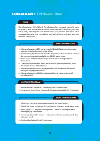 LONJAKAN 1 PENUAAN SIHATHASILMenjelang tahun 2030, Wilayah Persekutuan akan mencapai komuniti warga emas yang sihat secara holistik melalui penyertaan aktif dalam program gaya hidup sihat, akses kepada kemudahan fizikal yang selamat dan mesra umur, penjagaan komuniti yang menyokong serta perlindungan kesihatan asas yang mampan dan inklusif.KAEDAH PEMANTAUAN1.Sekurang-kurangnya 80% warga emas terlibat aktif dalam minimum satu program kesihatan komuniti setiap tahun. 2.Pemberian 10,000 Bakul Kesihatan / Kit Pemeriksaan Asas Kesihatan setahun dan memberi manfaat kepada hampir 50,000 warga emas.3.Pemasangan 200 Kerusi Rehat Ergonomik di lokasi strategik Wilayah Persekutuan.4.7.5 km laluan pejalan kaki mesra warga emas bagi mengelak risiko jatuh ditambah baik atau dibina Baharu .5.Sekurang-kurangnya 1,000 penjaga tidak formal menerima Latihan dan sokongan penjagaan kesihatan.6.Sekurang-kurangnya 25,000 penjaga tidak formal menerima insentif menjelang 2030.SIGNATURE PROGRAM1.%u201cEMASLine%u201d %u2013 Khidmat Nasihat Kesihatan Secara Talian Telefon2.%u201cEMASCare%u201d %u2013 One Stop Centre Khidmat Nasihat Kesihatan untuk warga emas.3.%u201cEMASJagaku%u201d %u2013 %u201cCaregivers Training Grant%u201d %u2013 bantuan kewangan untuk latihan penjaga tidak formal4.Community Network for Seniors %u2014 intervensi kesihatan, lawatan rumah dan sokongan sosial5.Dashbord Kesihatan Wilayah PersekutuanQUICKWIN PROGRAM1.Pemberian Bakul Kesihatan / Kit Pemeriksaan Asas Kesihatan2.Pemasangan Kerusi Rehat Ergonomik di lokasi strategik Wilayah Persekutuan52