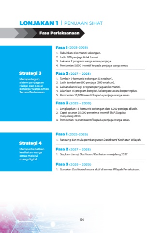 Memperteguhsistem penjagaan Fizikal dan Sosial penjaga Warga Emas Secara BerterusanStrategi 3Fasa 1 (2025-2026)Fasa 2 (2027 %u2013 2028)Fasa 3 (2029 %u2013 2030)1.Tubuhkan 3 komuniti sokongan.2.Latih 200 penjaga tidak formal.3.Laksana 2 program warga emas-penjaga.4.Pemberian 5,000 insentif kepada penjaga warga emas1.Tambah 9 komuniti sokongan (3 setahun).2.Latih tambahan 600 penjaga (200 setahun).3.Laksanakan 6 lagi program penjagaan komuniti.4.Jalankan 15 program bengkel/sokongan secara berperingkat.5.Pemberian 10,000 insentif kepada penjaga warga emas.1.Lengkapkan 15 komuniti sokongan dan 1,000 penjaga dilatih.2.Capai sasaran 25,000 penerima insentif EMASJagaku menjelang 2030.3.Pemberian 10,000 insentif kepada penjaga warga emas.Memperhebatkan kesihatan warga emas melalui ruang digitalStrategi 4Fasa 1 (2025-2026)Fasa 2 (2027 %u2013 2028)Fasa 3 (2029 %u2013 2030)1.Rancang dan mula pembangunan Dashboard Kesihatan Wilayah.1.Siapkan dan uji Dashboard Kesihatan menjelang 2027.1.Gunakan Dashboard secara aktif di semua Wilayah Persekutuan.Fasa PerlaksanaanLONJAKAN 1 PENUAAN SIHAT54