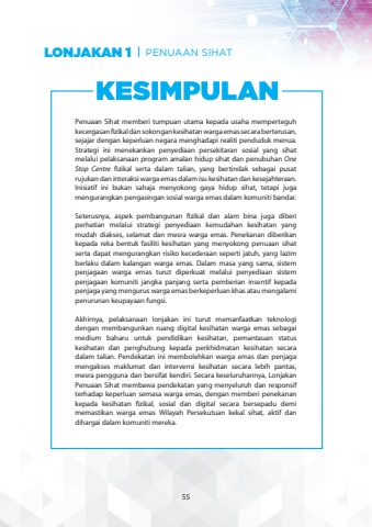 Penuaan Sihat memberi tumpuan utama kepada usaha memperteguh kecergasan fizikal dan sokongan kesihatan warga emas secara berterusan, sejajar dengan keperluan negara menghadapi realiti penduduk menua. Strategi ini menekankan penyediaan persekitaran sosial yang sihat melalui pelaksanaan program amalan hidup sihat dan penubuhan One Stop Centre fizikal serta dalam talian, yang bertindak sebagai pusat rujukan dan interaksi warga emas dalam isu kesihatan dan kesejahteraan. Inisiatif ini bukan sahaja menyokong gaya hidup sihat, tetapi juga mengurangkan pengasingan sosial warga emas dalam komuniti bandar.Seterusnya, aspek pembangunan fizikal dan alam bina juga diberi perhatian melalui strategi penyediaan kemudahan kesihatan yang mudah diakses, selamat dan mesra warga emas. Penekanan diberikan kepada reka bentuk fasiliti kesihatan yang menyokong penuaan sihat serta dapat mengurangkan risiko kecederaan seperti jatuh, yang lazim berlaku dalam kalangan warga emas. Dalam masa yang sama, sistem penjagaan warga emas turut diperkuat melalui penyediaan sistem penjagaan komuniti jangka panjang serta pemberian insentif kepada penjaga yang mengurus warga emas berkeperluan khas atau mengalami penurunan keupayaan fungsi.Akhirnya, pelaksanaan lonjakan ini turut memanfaatkan teknologi dengan membangunkan ruang digital kesihatan warga emas sebagai medium baharu untuk pendidikan kesihatan, pemantauan status kesihatan dan penghubung kepada perkhidmatan kesihatan secara dalam talian. Pendekatan ini membolehkan warga emas dan penjaga mengakses maklumat dan intervensi kesihatan secara lebih pantas, mesra pengguna dan bersifat kendiri. Secara keseluruhannya, Lonjakan Penuaan Sihat membawa pendekatan yang menyeluruh dan responsif terhadap keperluan semasa warga emas, dengan memberi penekanan kepada kesihatan fizikal, sosial dan digital secara bersepadu demi memastikan warga emas Wilayah Persekutuan kekal sihat, aktif dan dihargai dalam komuniti mereka.LONJAKAN 1 PENUAAN SIHAT55