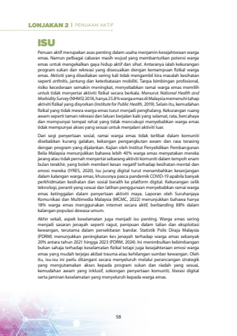 ISUPenuan aktif merupakan asas penting dalam usaha menjamin kesejahteraan warga emas. Namun pelbagai cabaran masih wujud yang membantutkan potensi warga emas untuk mengekalkan gaya hidup aktif dan sihat. Antaranya ialah kekurangan program sukan dan rekreasi yang disesuaikan dengan kemampuan fizikal warga emas. Aktiviti yang disediakan sering kali tidak mengambil kira masalah kesihatan seperti arthritis, jantung dan keterbatasan mobiliti. Tanpa bimbingan profesional, risiko kecederaan semakin meningkat, menyebabkan ramai warga emas memilih untuk tidak menyertai aktiviti fizikal secara berkala. Menurut National Health and Morbidity Survey (NHMS) 2018, hanya 25.8% warga emas di Malaysia memenuhi tahap aktiviti fizikal yang disyorkan (Institute for Public Health, 2019). Selain itu, kemudahan fizikal yang tidak mesra warga emas turut menjadi penghalang. Kekurangan ruang awam seperti taman rekreasi dan laluan berjalan kaki yang selamat, rata, bercahaya dan mempunyai tempat rehat yang tidak mencukupi menyebabkan warga emas tidak mempunyai akses yang sesuai untuk menjalani aktiviti luar. Dari segi penyertaan sosial, ramai warga emas tidak terlibat dalam komuniti disebabkan kurang galakan, kekangan pengangkutan awam dan rasa terasing dengan program yang dijalankan. Kajian oleh Institut Penyelidikan Pembangunan Belia Malaysia menunjukkan bahawa lebih 40% warga emas menyatakan mereka jarang atau tidak pernah menyertai sebarang aktiviti komuniti dalam tempoh enam bulan terakhir, yang boleh memberi kesan negatif terhadap kesihatan mental dan emosi mereka (IYRES, 2020). Isu jurang digital turut menambahkan kesenjangan dalam kalangan warga emas, khususnya pasca pandemik COVID-19 apabila banyak perkhidmatan kesihatan dan sosial beralih ke platform digital. Kekurangan celik teknologi, peranti yang sesuai dan latihan penggunaan menyebabkan ramai warga emas ketinggalan dalam penyertaan aktiviti maya. Laporan oleh Suruhanjaya Komunikasi dan Multimedia Malaysia (MCMC, 2022) menunjukkan bahawa hanya 18% warga emas menggunakan internet secara aktif, berbanding 88% dalam kalangan populasi dewasa umum.Akhir sekali, aspek keselamatan juga menjadi isu penting. Warga emas sering menjadi sasaran jenayah seperti ragut, penipuan dalam talian dan eksploitasi kewangan, terutama dalam persekitaran bandar. Statistik Polis Diraja Malaysia (PDRM) menunjukkan peningkatan kes jenayah terhadap warga emas sebanyak 20% antara tahun 2021 hingga 2023 (PDRM, 2024). Ini menimbulkan kebimbangan bukan sahaja terhadap keselamatan fizikal tetapi juga kesejahteraan emosi warga emas yang mudah terjejas akibat trauma atau kehilangan sumber kewangan. Oleh itu, isu-isu ini perlu ditangani secara menyeluruh melalui perancangan strategik yang mengutamakan akses kepada program sukan dan riadah yang sesuai, kemudahan awam yang inklusif, sokongan penyertaan komuniti, literasi digital serta jaminan keselamatan yang menyeluruh kepada warga emas.LONJAKAN 2 PENUAAN AKTIF58
