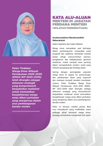 Assalamualaikum Warahmatullahi WabarakatuhSalam Sejahtera dan Salam Madani.Warga emas merupakan aset berharga dalam pembangunan masyarakat yang progresif dan sejahtera. Kehadiran mereka bukan sahaja mencerminkan warisan, pengalaman dan kebijaksanaan generasi terdahulu, malah menjadi teras penting dalam memperkukuh struktur sosial yang inklusif, penyayang dan berdaya tahan.Seiring dengan peningkatan populasi warga emas di negara ini, perancangan dan pelaksanaan dasar yang responsif dan mampan menjadi semakin mendesak. Justeru, Pelan Tindakan Warga Emas Wilayah Persekutuan 2025%u20132030 (EMASWP 2025%u20132030) telah dirangka sebagai dokumen strategik yang komprehensif, berpaksikan matlamat untuk memastikan kesejahteraan warga emas diberi perhatian yang sewajarnya dalam arus pembangunan bandar moden.Pelan ini disusun melalui proses libat urus menyeluruh yang melibatkan suara pelbagai pihak termasuk warga emas, penjaga, pertubuhan masyarakat sivil, pakar KATA ALU-ALUANMENTERI DI JABATAN PERDANA MENTERI (WILAYAH PERSEKUTUAN)vi