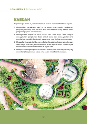 KAEDAHBagi mencapai hasrat ini, Lonjakan Penuaan Aktif ini akan memberi fokus kepada:1.Menyediakan persekitaran aktif untuk warga emas melalui pelaksanaan program gaya hidup sihat dan aktif serta pembangunan ruang rekreasi awam yang dilengkapi ciri-ciri mesra usia;2.Meningkatkan penyertaan sosial secara aktif oleh warga emas dengan menggalakkan penglibatan dalam aktiviti sosial dan bermasyarakat serta memberikan pengiktirafan kepada warga emas yang aktif dan menyumbang;3.Merapatkan jurang digital dan meningkatkan literasi teknologi serta keselamatan siber warga emas dengan menyediakan akses kepada latihan literasi digital mesra usia dan kesedaran keselamatan digital; dan4.Memperkasa kebajikan penduduk melalui pemerkasaan komuniti prihatin yang menyokong kesejahteraan warga emas secara inklusif dan berterusan.LONJAKAN 2 PENUAAN AKTIF62