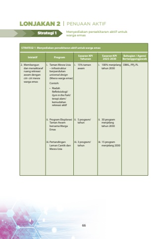 STRATEGI 1 Menyediakan persekitaran aktif untuk warga emasInisiatifProgramSasaran KPI TahunanSasaran KPI 2025-2030Bahagian / Agensi Bertanggungjawab2.Membangun dan menaiktaraf ruang rekreasi awam dengan ciri- ciri mesra warga emasi.Taman Mesra Usia %u2013 infrastruktur berpandukan universal design(Mesra warga emas)Contoh:%u2022Riadah Refleksiologi/ Gym in the Park/ terapi alam/ kemudahan rekreasi aktifi.15% taman awami.100% menjelang tahun 2030DBKL, PPj, PLii.Program Eksplorasi Taman Awam bersama Warga Emasii.5 program/ tahunii.30 program menjelang tahun 2030iii.Pertandingan Laman Cantik dan Mesra Usiaiii.3 program/ tahuniii.15 program menjelang 2030Menyediakan persekitaran aktif untuk warga emasStrategi 1LONJAKAN 2 PENUAAN AKTIF66