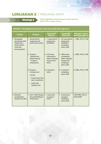 STRATEGI 2 Meningkatkan penyertaan sosial secara aktif oleh warga emasInisiatifProgramSasaran KPI TahunanSasaran KPI 2025-2030Bahagian / Agensi Bertanggungjawab1.Menggalak penyertaan aktif warga emas dalam aktiviti sosial dan bermasyarakati.Ruang aktiviti warga emas di premis perumahani.7 ruang aktiviti warga emas disediakani.30 ruang aktiviti warga emas disediakan menjelang tahun 2030i.DBKL, PPj, PL, PKBii.Program %u201cWarga Emas Menyumbang%u201d %u2013 Program sukarelawanii.300 orang sukarelawan dalam kalangan warga emas/ tahunii.1000 orang sukarelawan dalam kalangan warga emas menjelang tahun 2030ii.DBKL, PPj, PL, PKBiii.Program IntergenerasiContoh:%u2022Projek Cerita Dari Dulu(CerDULU));%u2022Ziarah dan Sahabat Usiaiii.3 program/tahuniii.15 program menjelang tahun 2030iii.DBKL, PPj, PL, PKB2.Memberi pengiktirafan warga emas aktifi.Ikon / Tokoh Warga Emas Aktif Wilayah Persekutuani.5 penerima anugerah / tahuni.25 penerima anugerah menjelang tahun 2030JWP, DBKL, PPj, PL, PKB, MSWPMeningkatkan penyertaan sosial secara aktif oleh warga emasStrategi 2LONJAKAN 2 PENUAAN AKTIF67