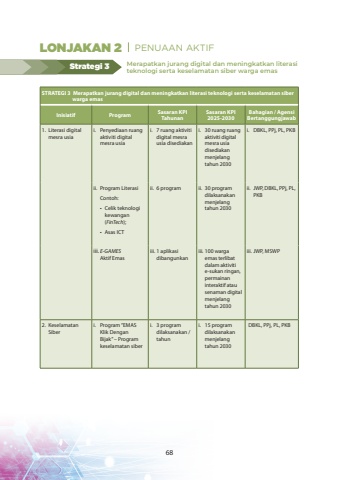 STRATEGI 3 Merapatkan jurang digital dan meningkatkan literasi teknologi serta keselamatan siber warga emasInisiatifProgramSasaran KPI TahunanSasaran KPI 2025-2030Bahagian / Agensi Bertanggungjawab1.Literasi digital mesra usiai.Penyediaan ruang aktiviti digital mesra usiai.7 ruang aktiviti digital mesra usia disediakani.30 ruang ruang aktiviti digital mesra usia disediakan menjelang tahun 2030i.DBKL, PPj, PL, PKBii.Program LiterasiContoh:%u2022Celik teknologi kewangan (FinTech);%u2022Asas ICTii.6 programii.30 program dilaksanakan menjelang tahun 2030ii.JWP, DBKL, PPj, PL, PKBiii.E-GAMES Aktif Emasiii.1 aplikasi dibangunkaniii.100 warga emas terlibat dalam aktiviti e-sukan ringan, permainan interaktif atau senaman digital menjelang tahun 2030iii.JWP, MSWP2.Keselamatan Siberi.Program %u201cEMAS Klik Dengan Bijak%u201d %u2013 Program keselamatan siberi.3 program dilaksanakan / tahuni.15 program dilaksanakan menjelang tahun 2030DBKL, PPj, PL, PKBMerapatkan jurang digital dan meningkatkan literasi teknologi serta keselamatan siber warga emasStrategi 3LONJAKAN 2 PENUAAN AKTIF68