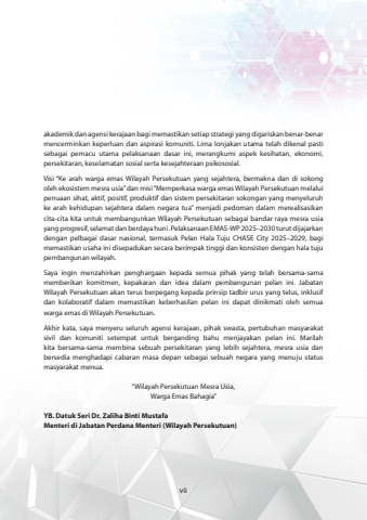 akademik dan agensi kerajaan bagi memastikan setiap strategi yang digariskan benar-benar mencerminkan keperluan dan aspirasi komuniti. Lima lonjakan utama telah dikenal pasti sebagai pemacu utama pelaksanaan dasar ini, merangkumi aspek kesihatan, ekonomi, persekitaran, keselamatan sosial serta kesejahteraan psikososial.Visi %u201cKe arah warga emas Wilayah Persekutuan yang sejahtera, bermakna dan di sokong oleh ekosistem mesra usia%u201d dan misi %u201cMemperkasa warga emas Wilayah Persekutuan melalui penuaan sihat, aktif, positif, produktif dan sistem persekitaran sokongan yang menyeluruh ke arah kehidupan sejahtera dalam negara tua%u201d menjadi pedoman dalam merealisasikan cita-cita kita untuk membangunkan Wilayah Persekutuan sebagai bandar raya mesra usia yang progresif, selamat dan berdaya huni. Pelaksanaan EMAS-WP 2025%u20132030 turut dijajarkan dengan pelbagai dasar nasional, termasuk Pelan Hala Tuju CHASE City 2025%u20132029, bagi memastikan usaha ini disepadukan secara berimpak tinggi dan konsisten dengan hala tuju pembangunan wilayah.Saya ingin menzahirkan penghargaan kepada semua pihak yang telah bersama-sama memberikan komitmen, kepakaran dan idea dalam pembangunan pelan ini. Jabatan Wilayah Persekutuan akan terus berpegang kepada prinsip tadbir urus yang telus, inklusif dan kolaboratif dalam memastikan keberhasilan pelan ini dapat dinikmati oleh semua warga emas di Wilayah Persekutuan.Akhir kata, saya menyeru seluruh agensi kerajaan, pihak swasta, pertubuhan masyarakat sivil dan komuniti setempat untuk berganding bahu menjayakan pelan ini. Marilah kita bersama-sama membina sebuah persekitaran yang lebih sejahtera, mesra usia dan bersedia menghadapi cabaran masa depan sebagai sebuah negara yang menuju status masyarakat menua.%u201cWilayah Persekutuan Mesra Usia,Warga Emas Bahagia%u201d YB. Datuk Seri Dr. Zaliha Binti MustafaMenteri di Jabatan Perdana Menteri (Wilayah Persekutuan)vii