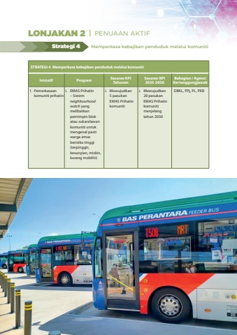 STRATEGI 4 Memperkasa kebajikan penduduk melalui komunitiInisiatifProgramSasaran KPI TahunanSasaran KPI 2025-2030Bahagian / Agensi Bertanggungjawab1.Pemerkasaan komuniti prihatini.EMAS Prihatin %u2013 Sistem neighbourhood watch yang melibatkan pemimpin blok atau sukarelawan komuniti untuk mengenal pasti warga emas berisiko tinggi (terpinggir, kesunyian, miskin, kurang mobiliti)i.Mewujudkan 5 pasukan EMAS Prihatin komunitii.Mewujudkan 20 pasukan EMAS Prihatin komuniti menjelang tahun 2030DBKL, PPj, PL, PKBStrategi 4Memperkasa kebajikan penduduk melalui komunitiLONJAKAN 2 PENUAAN AKTIF69